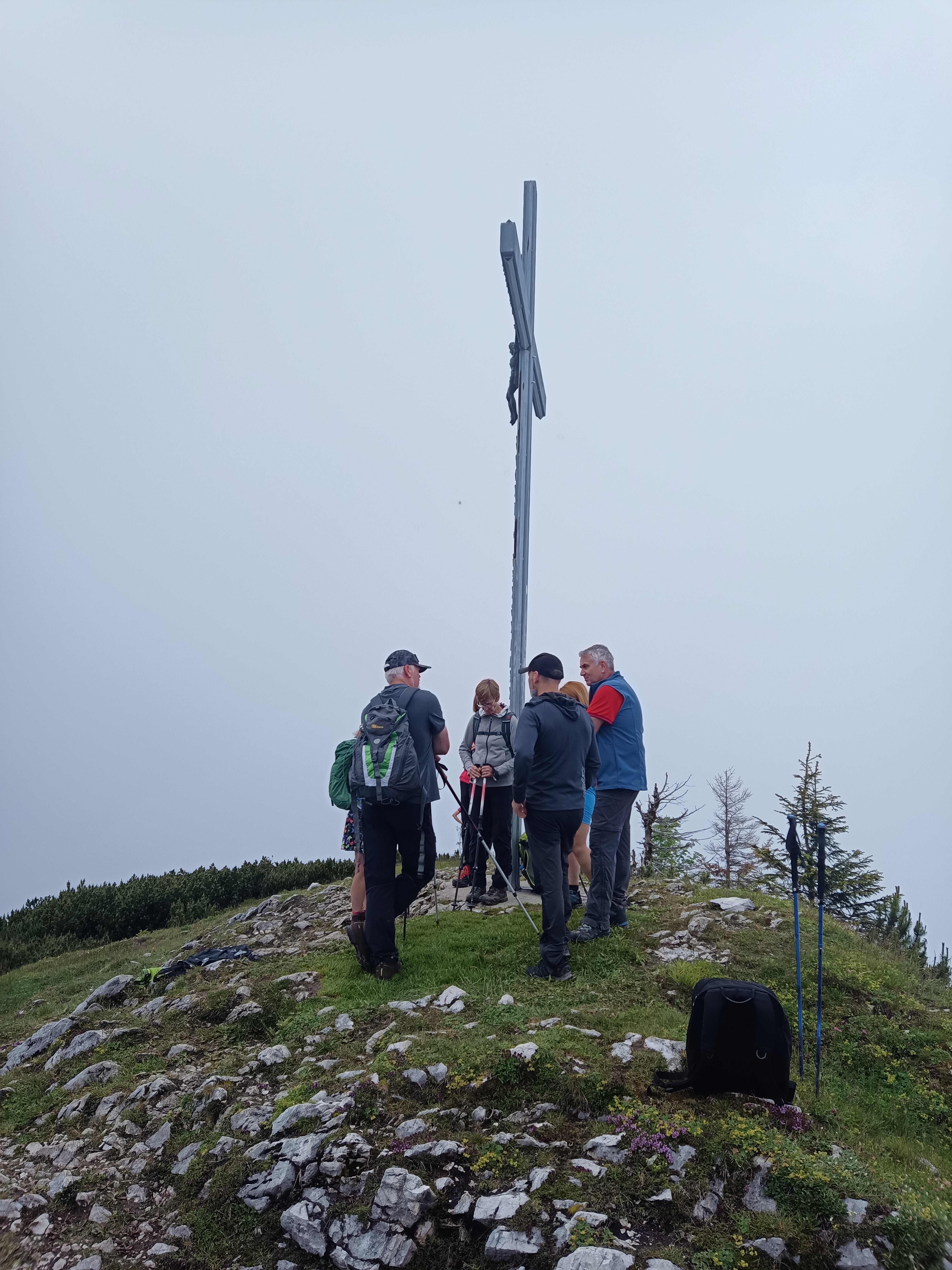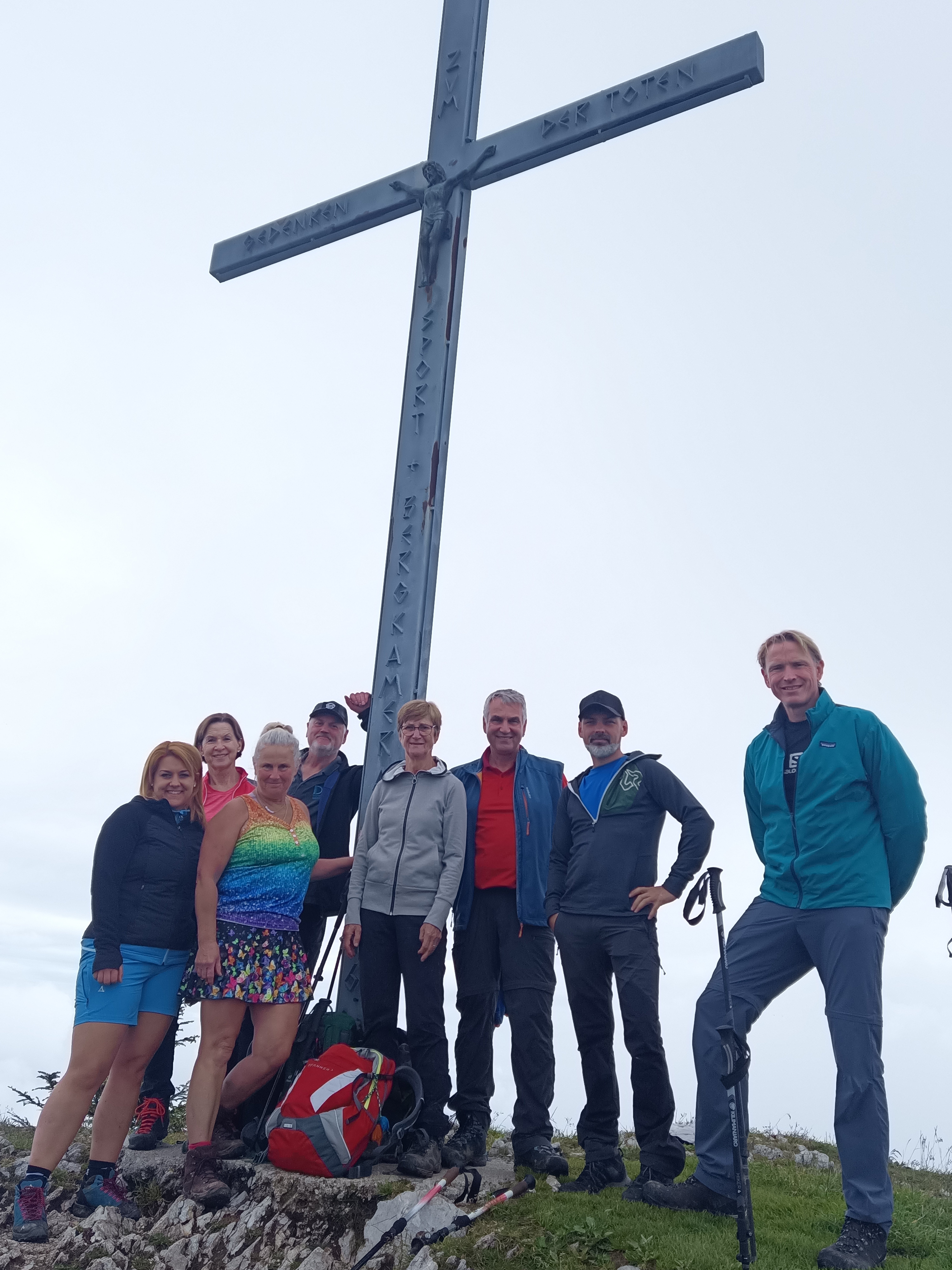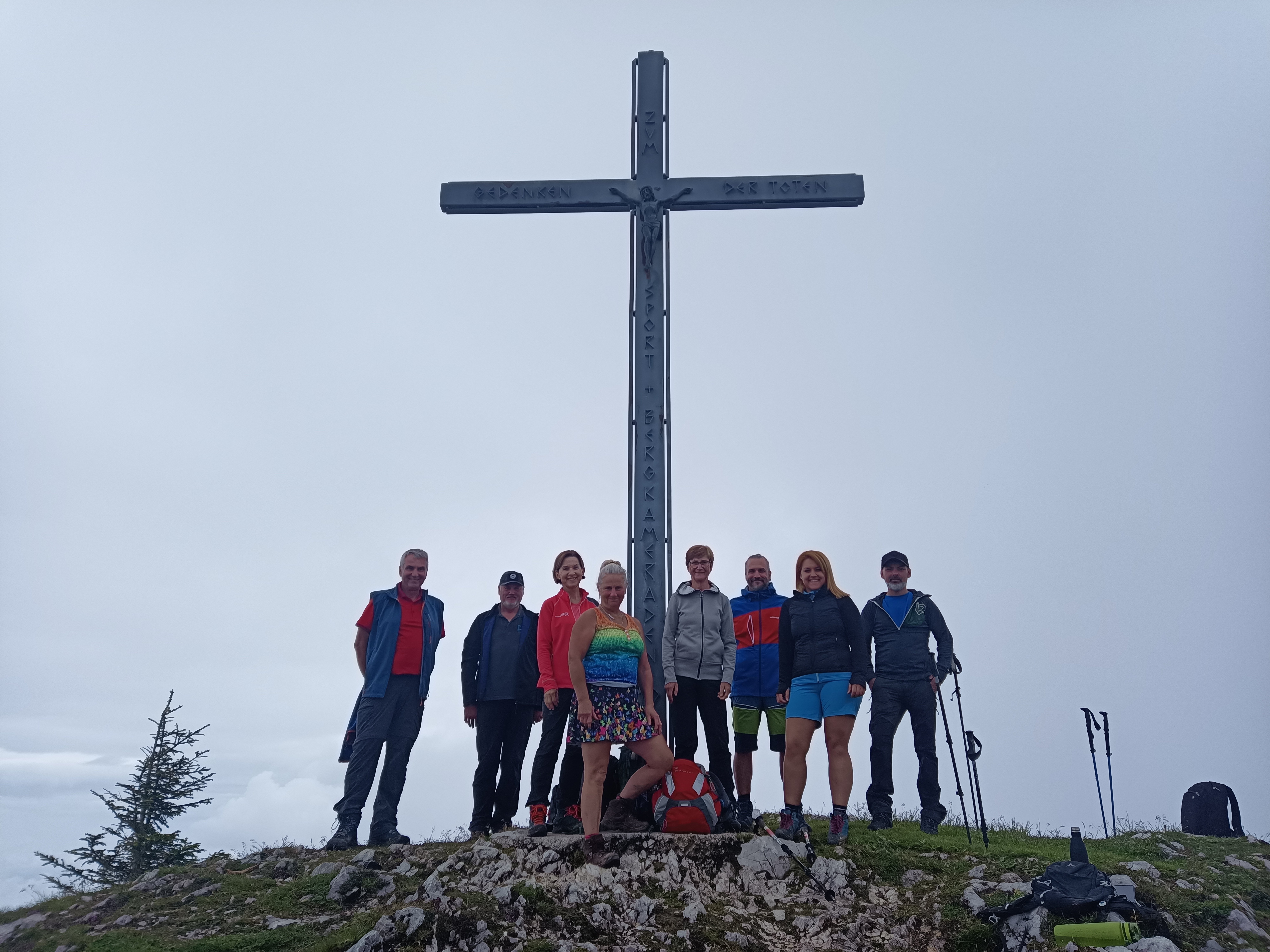 Trotz dieser Bedingungen schaffte die Gruppe einen sehr sportlichen Aufstieg zum Gipfel, der am Ende über den grasigen Sattel verlief. Bei der Gipfelbrotzeit blieb leider der Ausblick verwährt, da die Wolken die umliegenden Berge noch deutlich im Griff hatten, während unten im Tal bereits die Sonner hervorspitzte. Aufgrund eines tödlichen Absturzes auf der Südseite des Streichers in der vorherigen Woche entschied sich die Gruppe den Abstieg über den Aufstiegsweg zu machen.