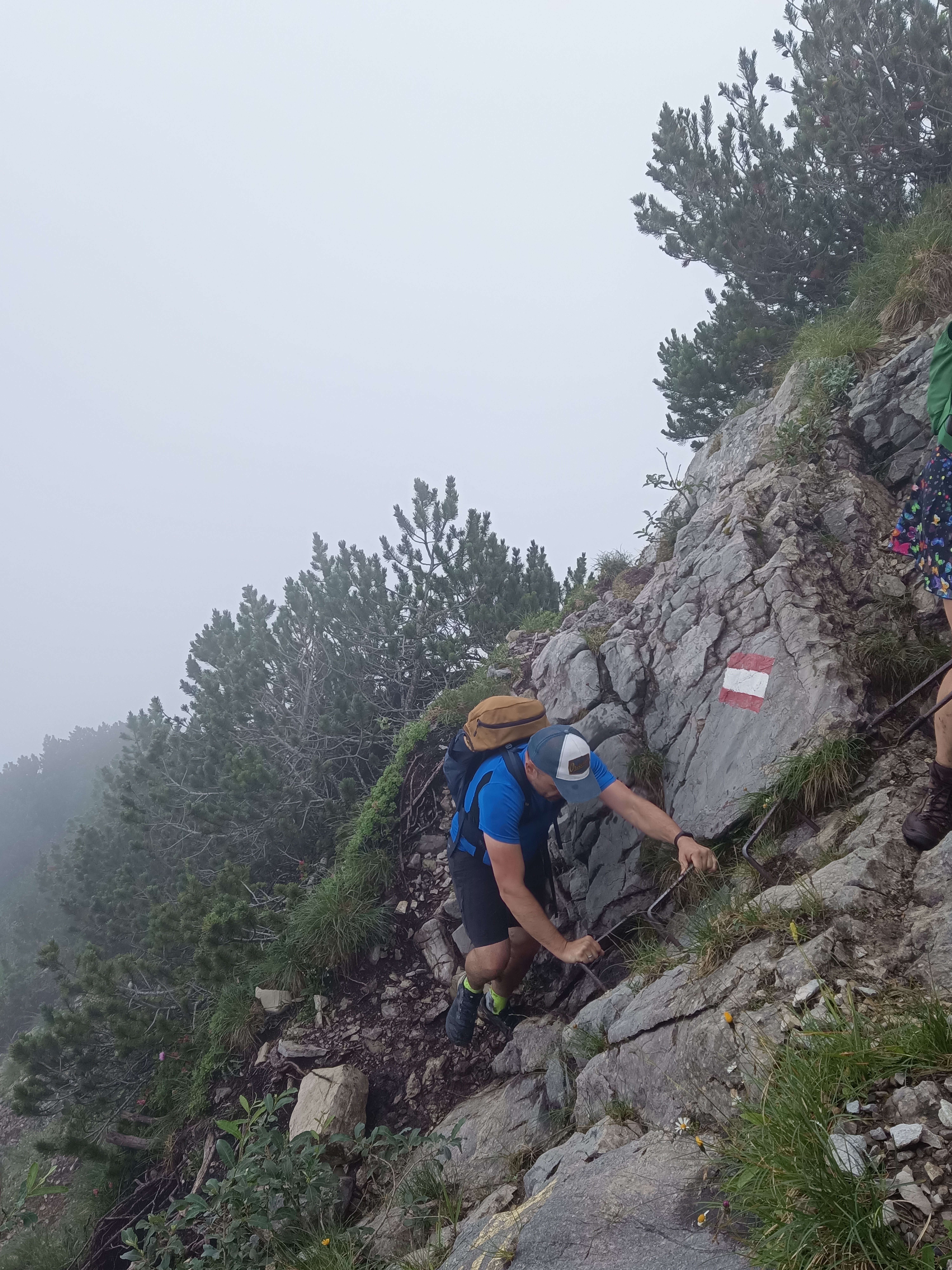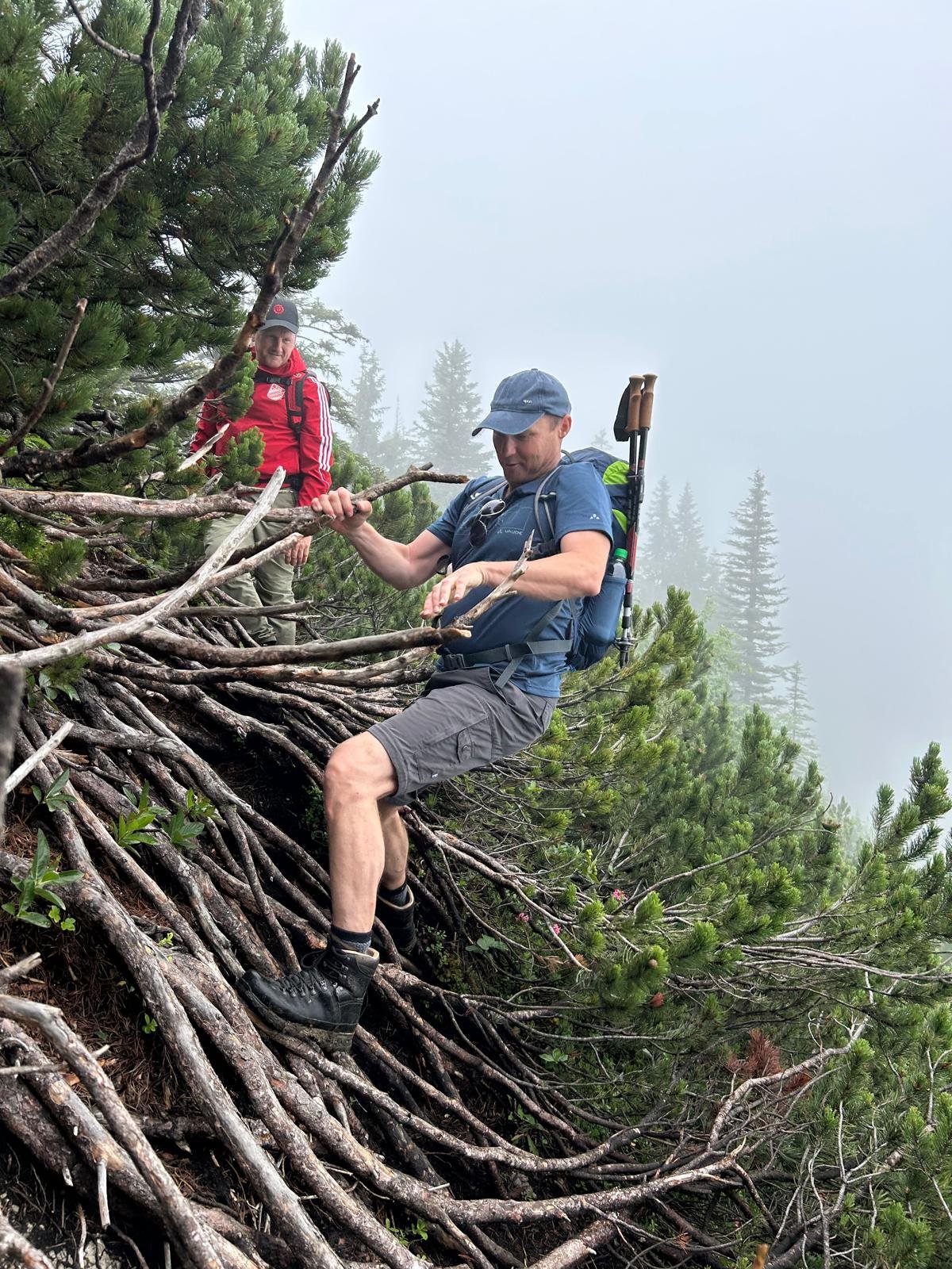 Von der Walleralm wurde bereits nach wenigen Höhenmetern der Voglsang ein kleiner Gipfel nahe der Alm erreicht. Ab hier zog sich der Weg an einem Grat entlang, teilweise durch unwegsames und latschenbedecktes Terrain. Bald kamen auch noch naße Felsen, Trittbügel und Stahlseilsicherungen beim Aufschwung zum 1723 Meter hohen kleinen Traithen dazu.