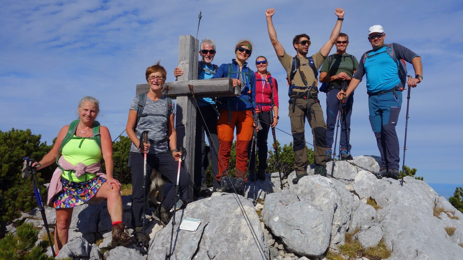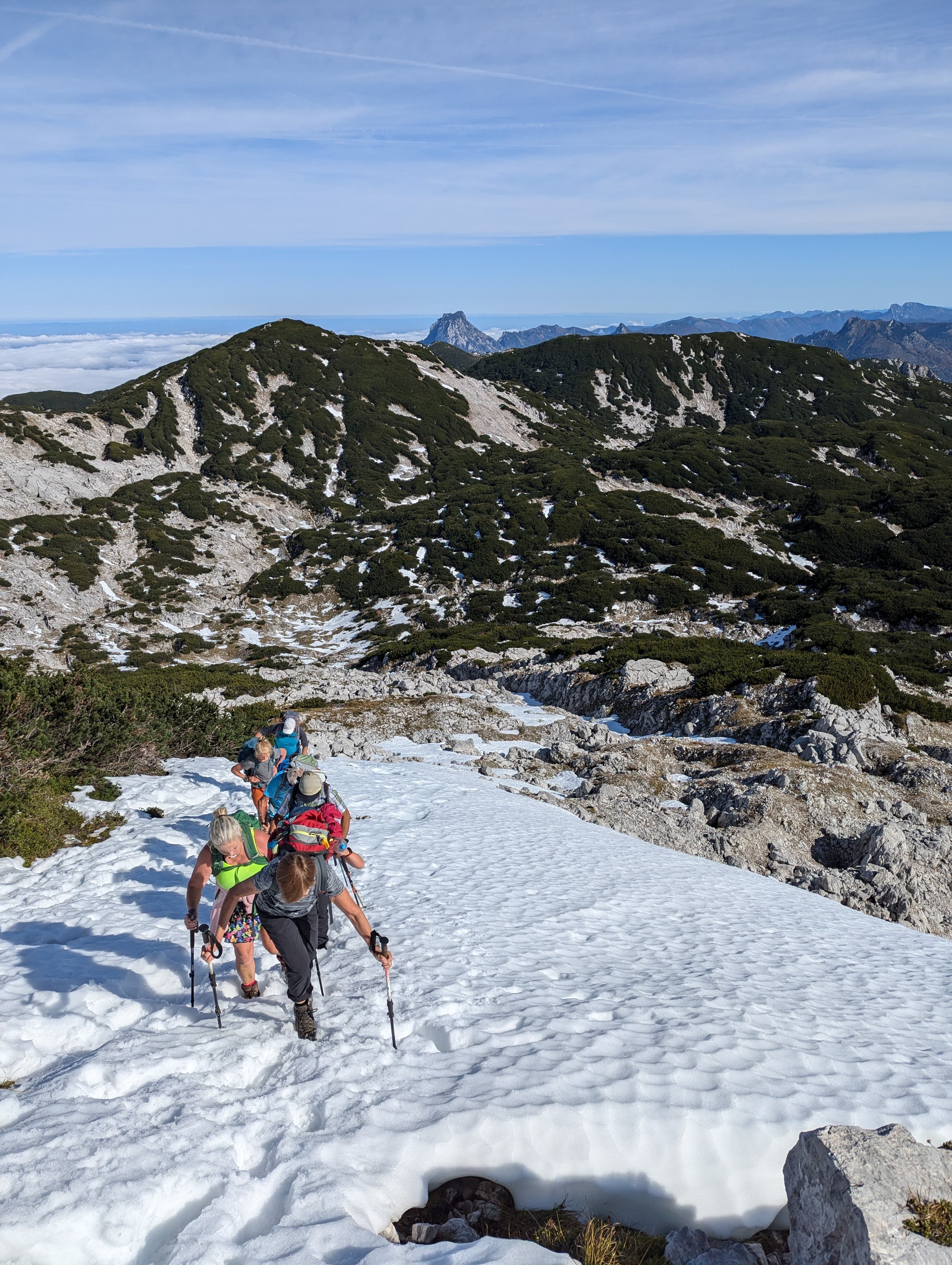 Nach ca. 4,5 Stunden hatten wir den 1862 Metern hohen Höllkogel erreicht. Hier genossen wir bei einer wohlverdienten Brotzeit den herrlichen Rundumblick und konnten dabei den weiterhin Nebelverhangenen Norden einsehen, den Attersee sowie Traunsee und dessen dazugehörigen Berg den Traunstein.