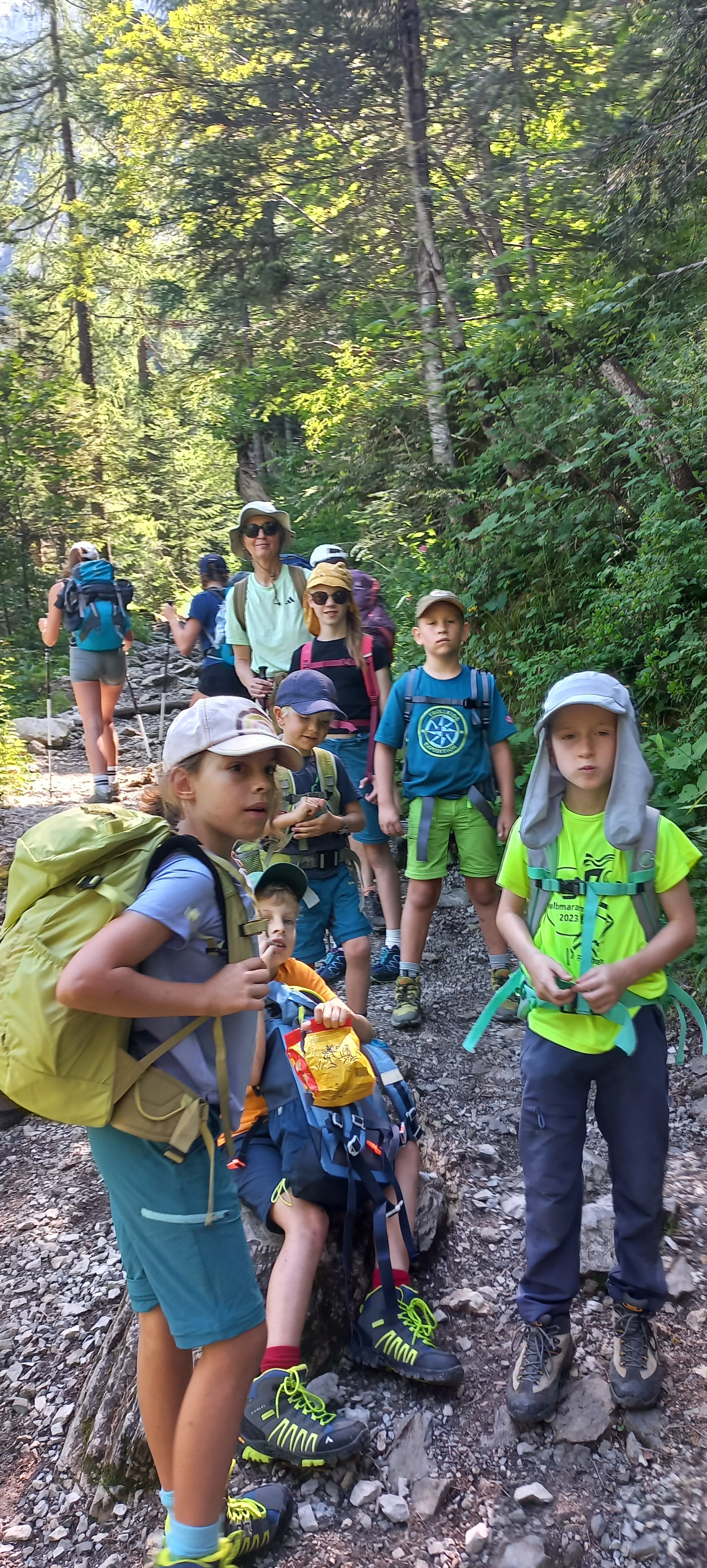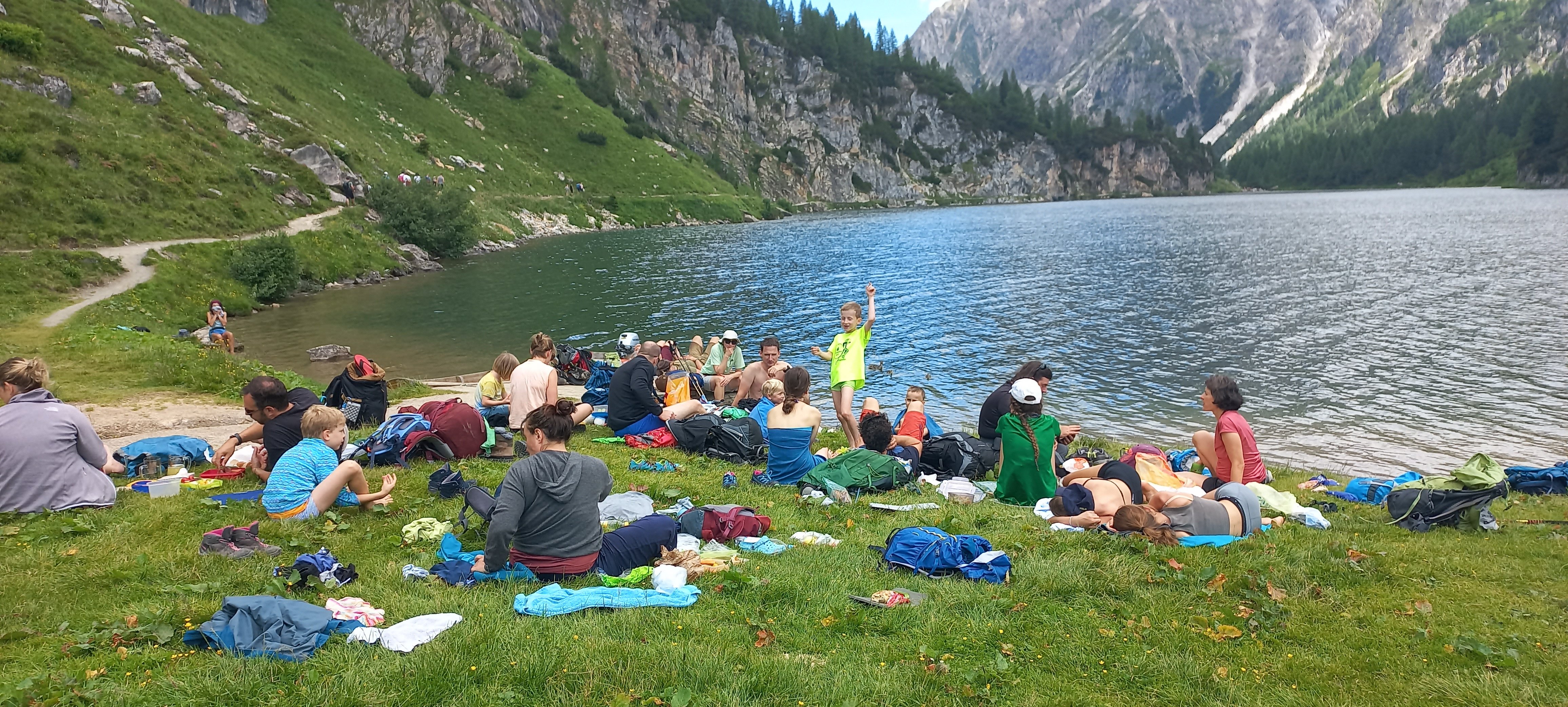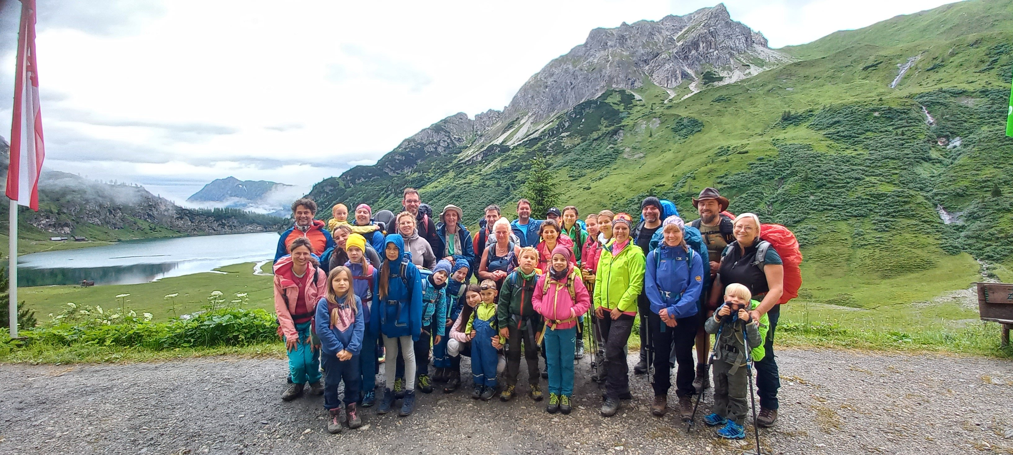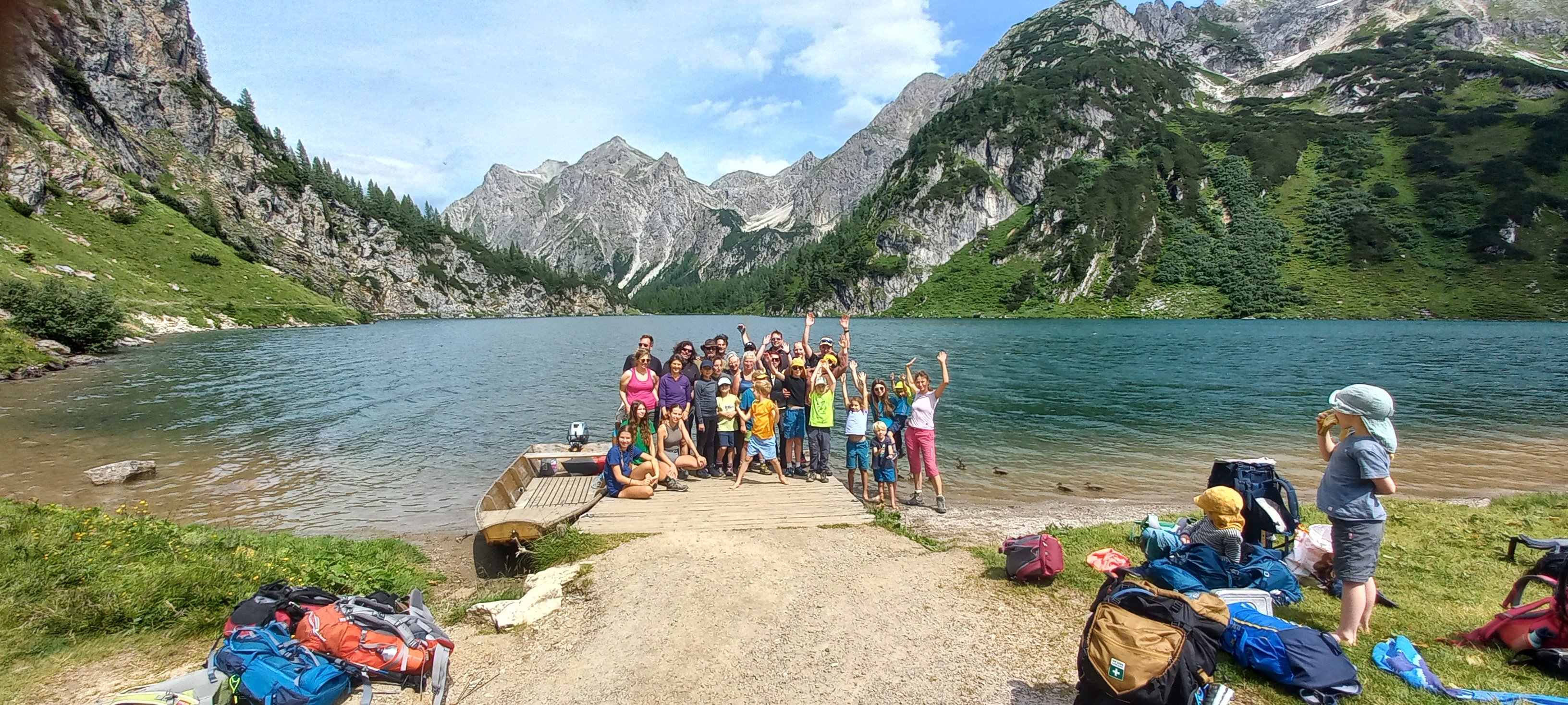 Bei strahlendem Sonnenschein machte sich die 25 köpfige Familiengruppe auf den Weg zum Tappenkarsee. Vom Parkplatz oberhalb der Schwabalmseen ging es los und gleich mal steil bergauf durch den schattenspendenden Wald. Wir mussten einen Bachlauf ohne Brücke überqueren doch es sind alle trockenen Fußes drüben angekommen. Zum Lohn gab es einen Ausblick auf einen herrlichen hohen Wasserfall, der vom Wasser des Tappenkarssees gespeist wird. Die weitere Marschrichtung war also klar. Endlich am See angekommen, machten wir am wunderschönen Ufer eine ausgiebige Brotzeit, wer wollte konnte in der Sonne dösen und ganz Waagemutige stürzten sich sogar in die eiskalten Fluten. Den letzten Anstieg zur Tappenkarseehütte meisternten dann alle frisch gestärkt problemlos.
