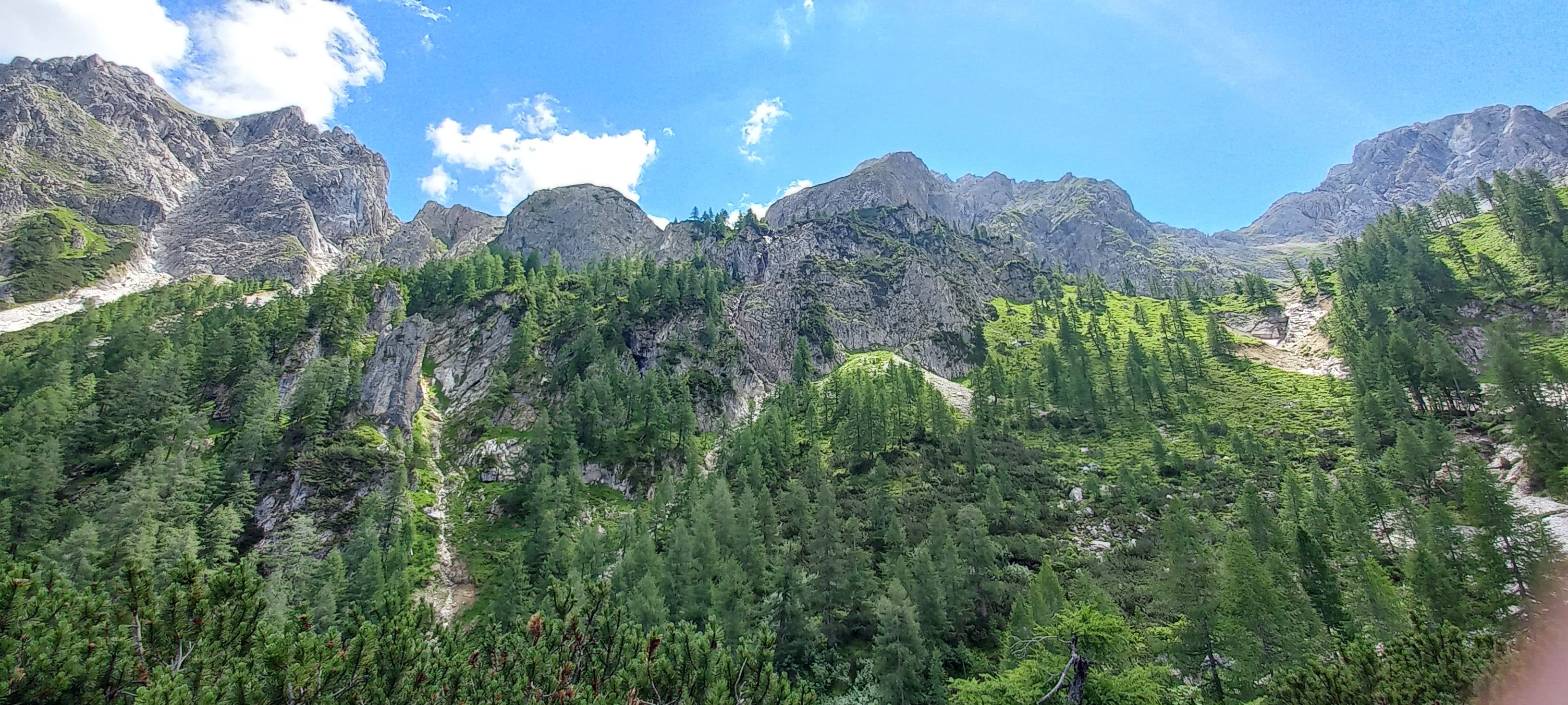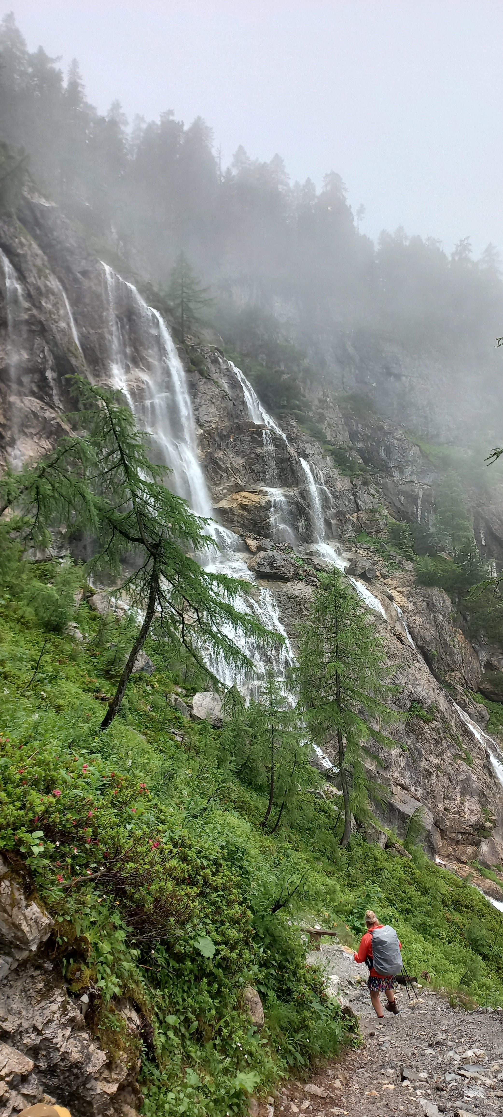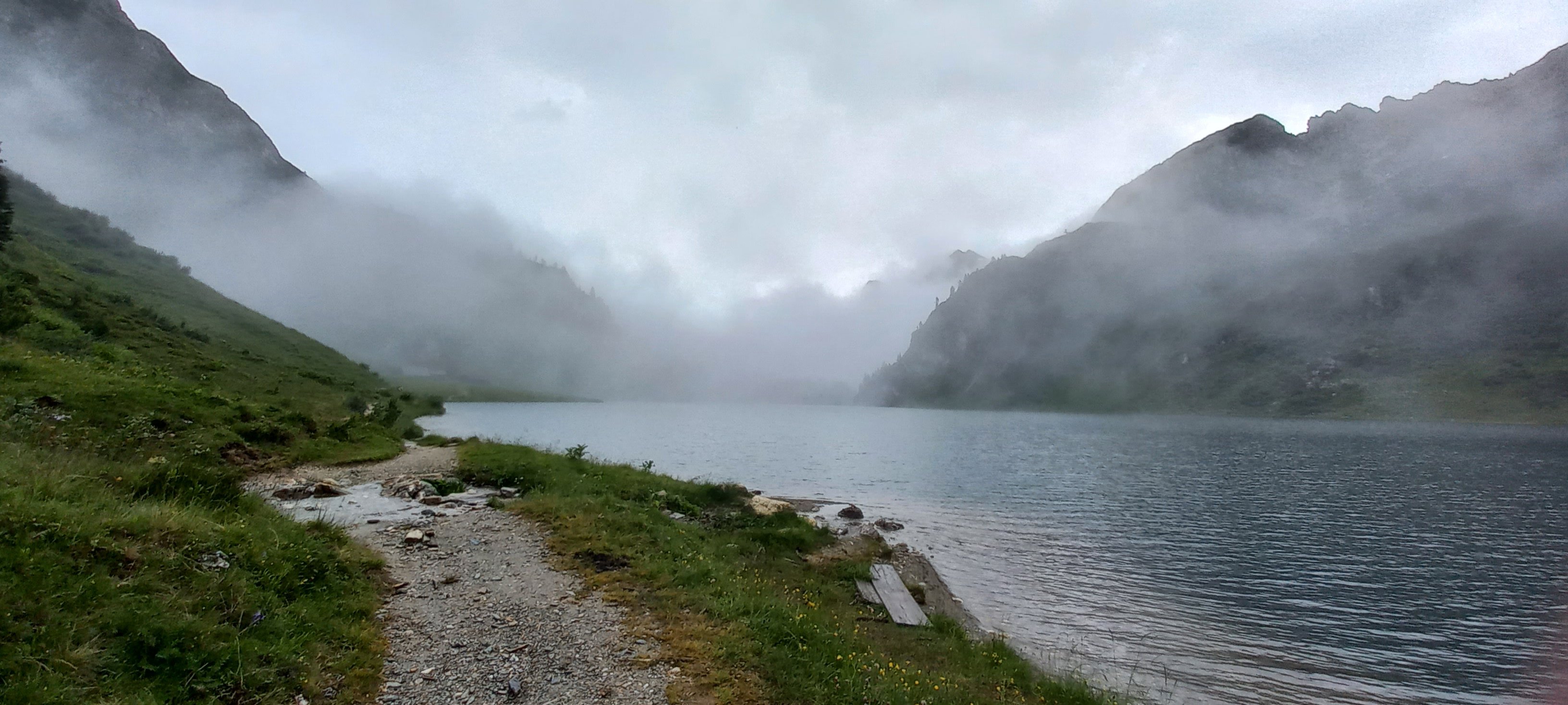 Nach einer kuscheligen Nacht im Matratzenlager beeilten wir uns am nächsten Morgen, den Rückmarsch anzutreten, da schlechtes Wetter aufzog. Doch bis auf eine halbe Stunde Nieselregen blieben wir relativ trocken und genossen das Schauspiel der aufziehenden Wolken. Ein Highligt waren dann auch noch zwei Pferde, die uns entgegen kamen und gerade zur Alm gebracht wurden.