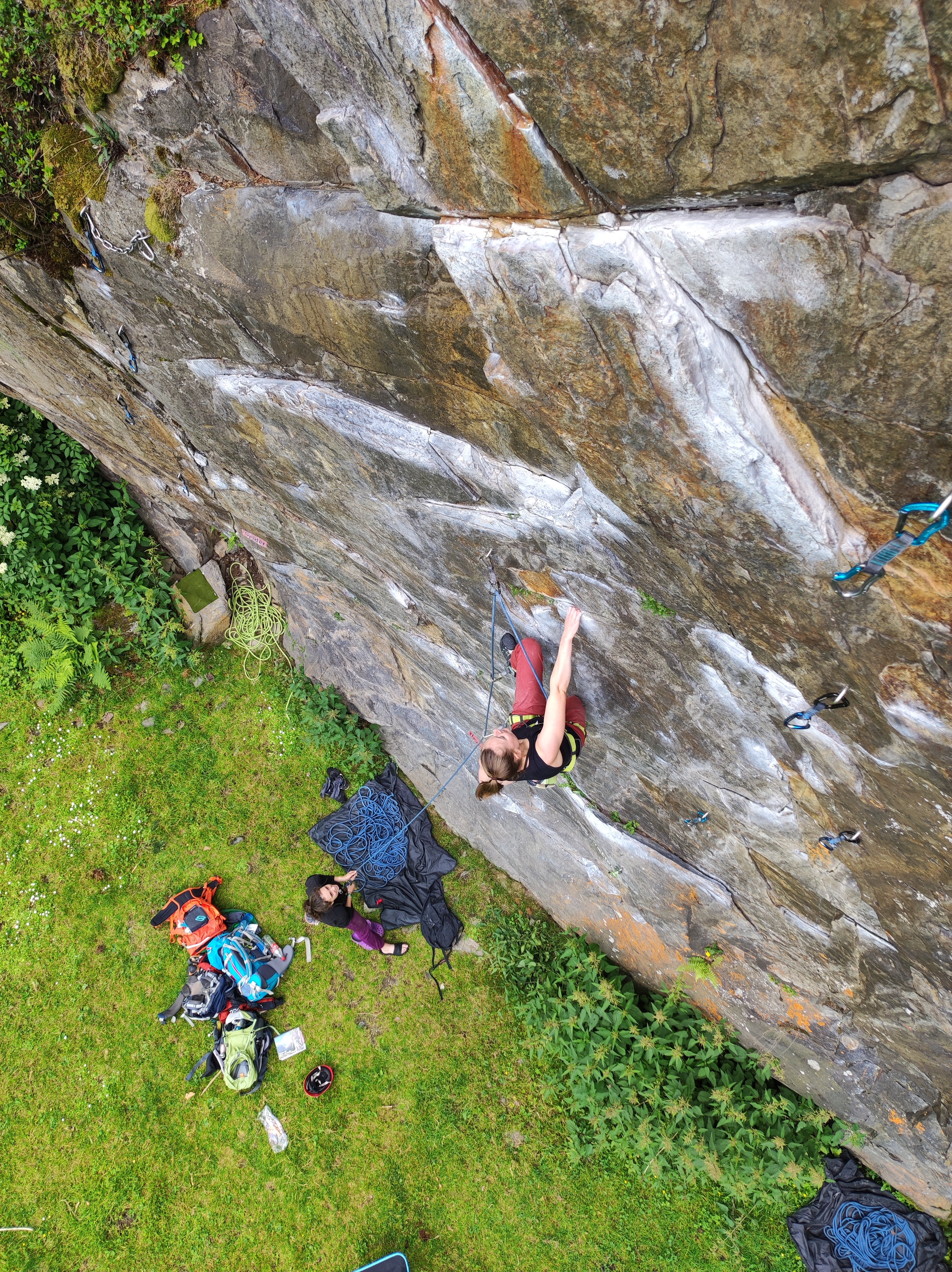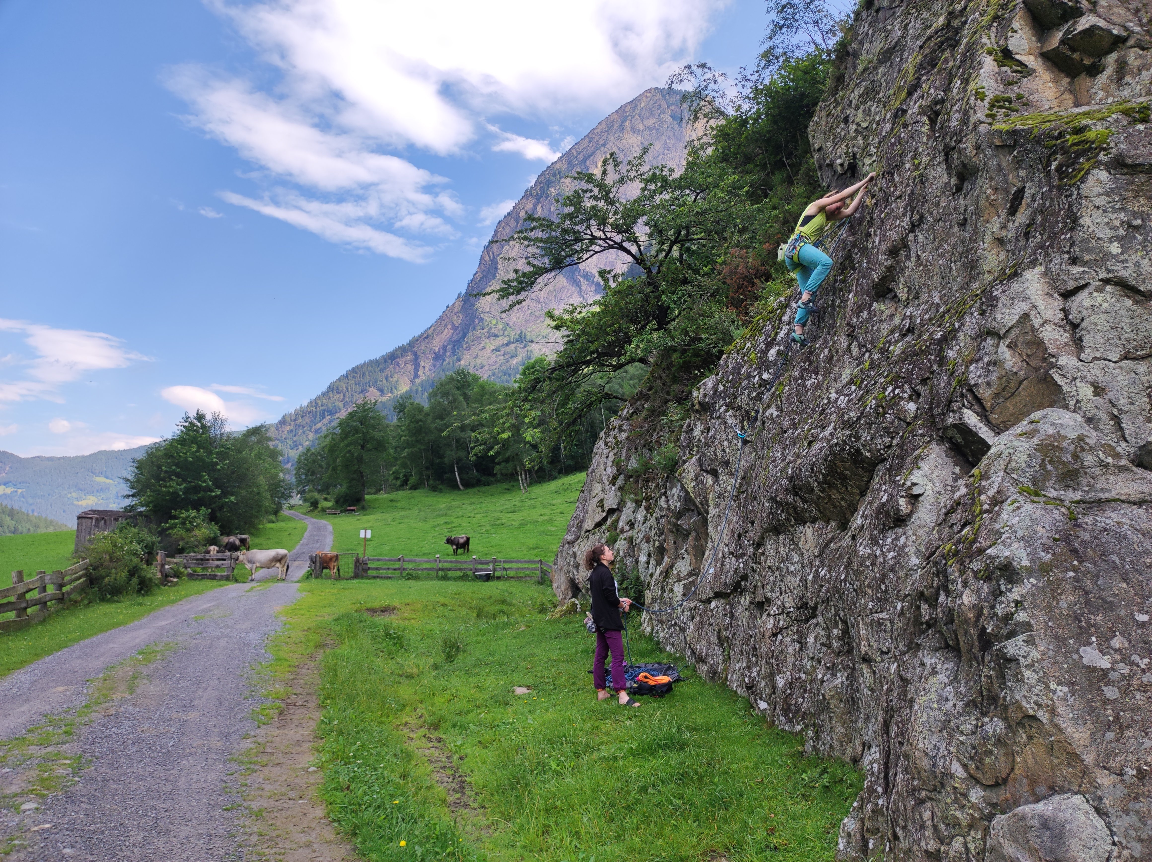 Am letzten Tag, nach Abbauen des Zeltes, auschecken am Campingplatz und Auto einräumen, bestieg die Gruppe noch ein paar schöne Routen an der Engelswand, ein Felsen direkt an einer idyllischen Kuhweide gelegen, bevor es auf den Heimweg ging.