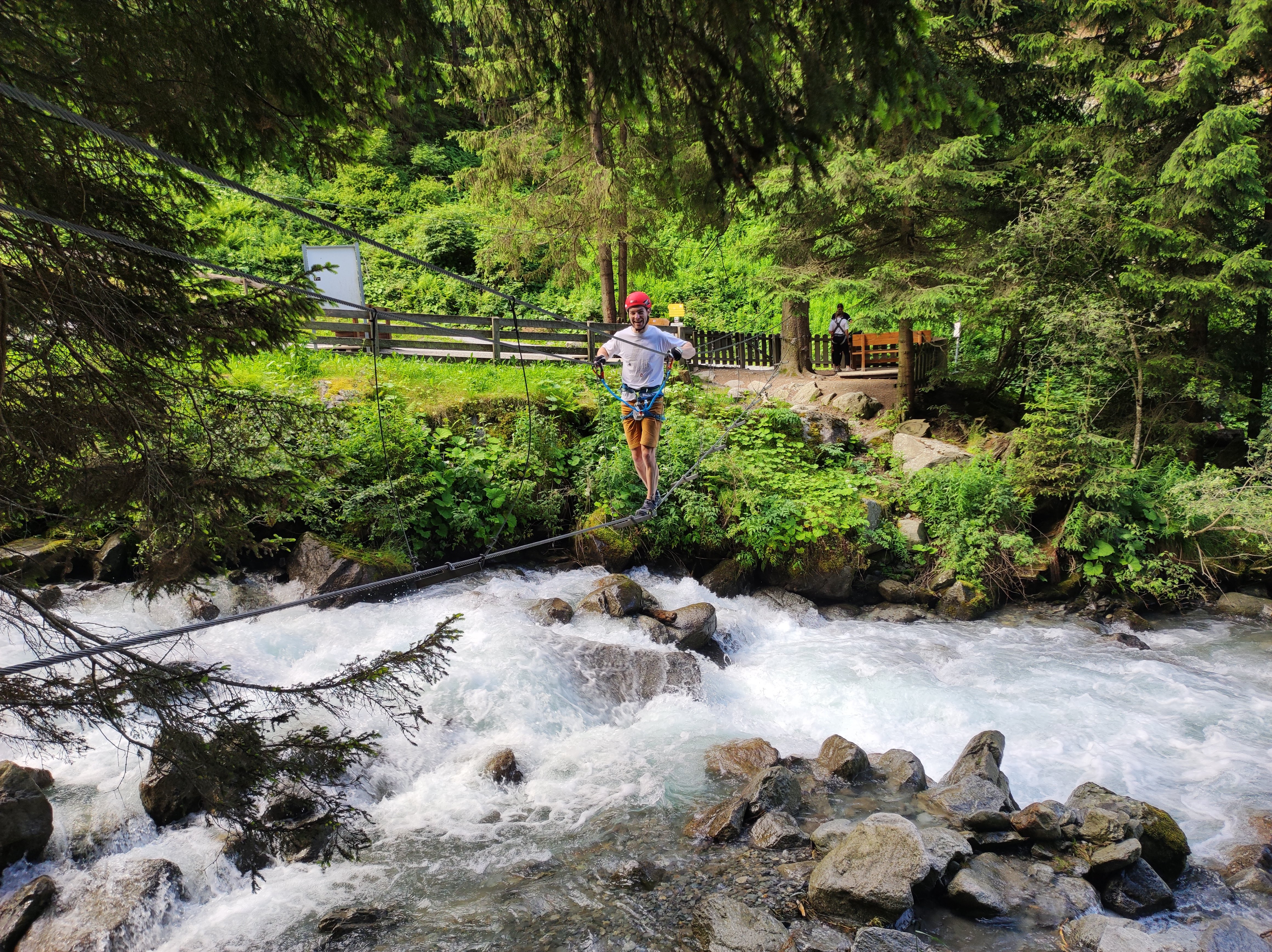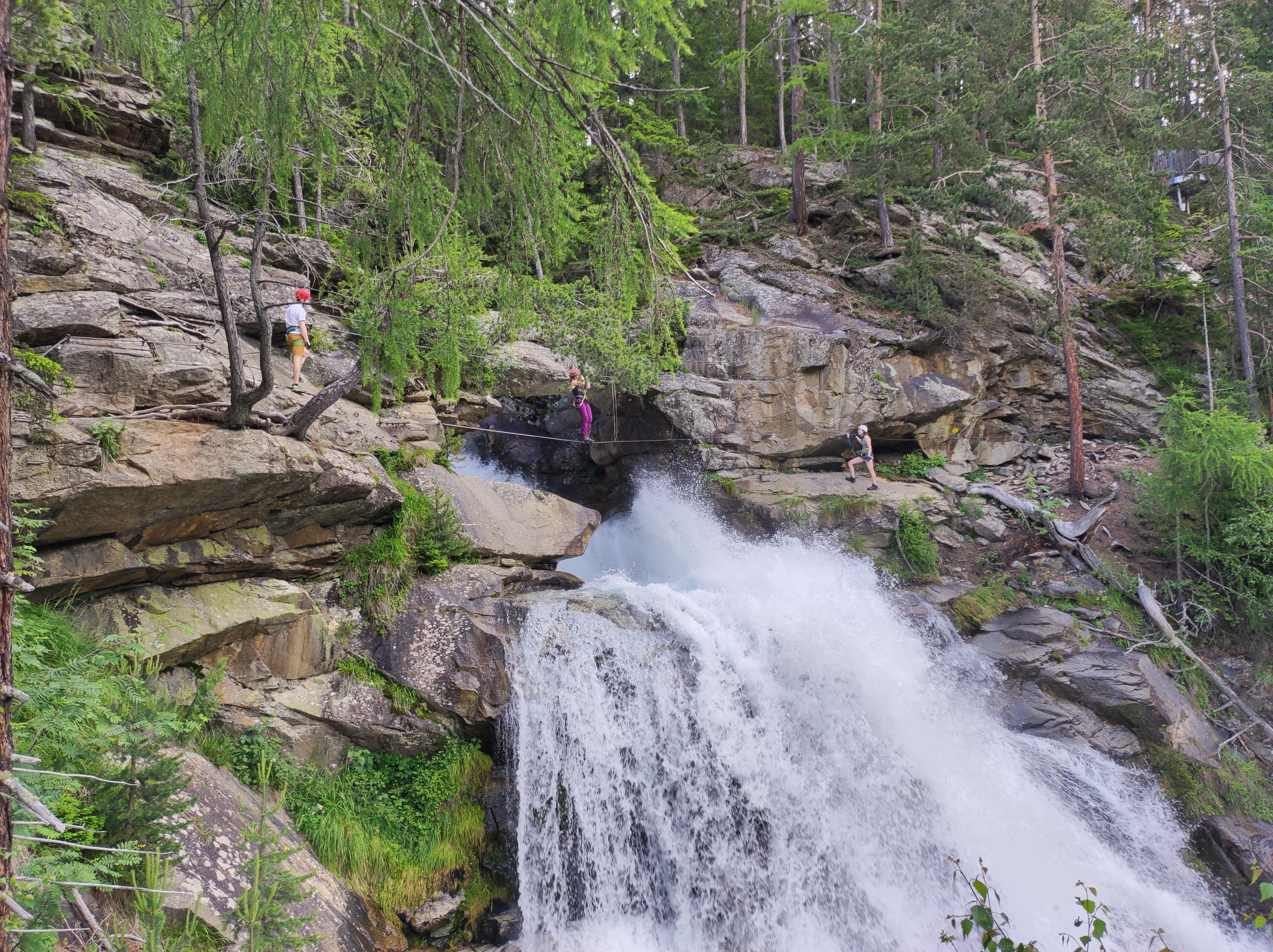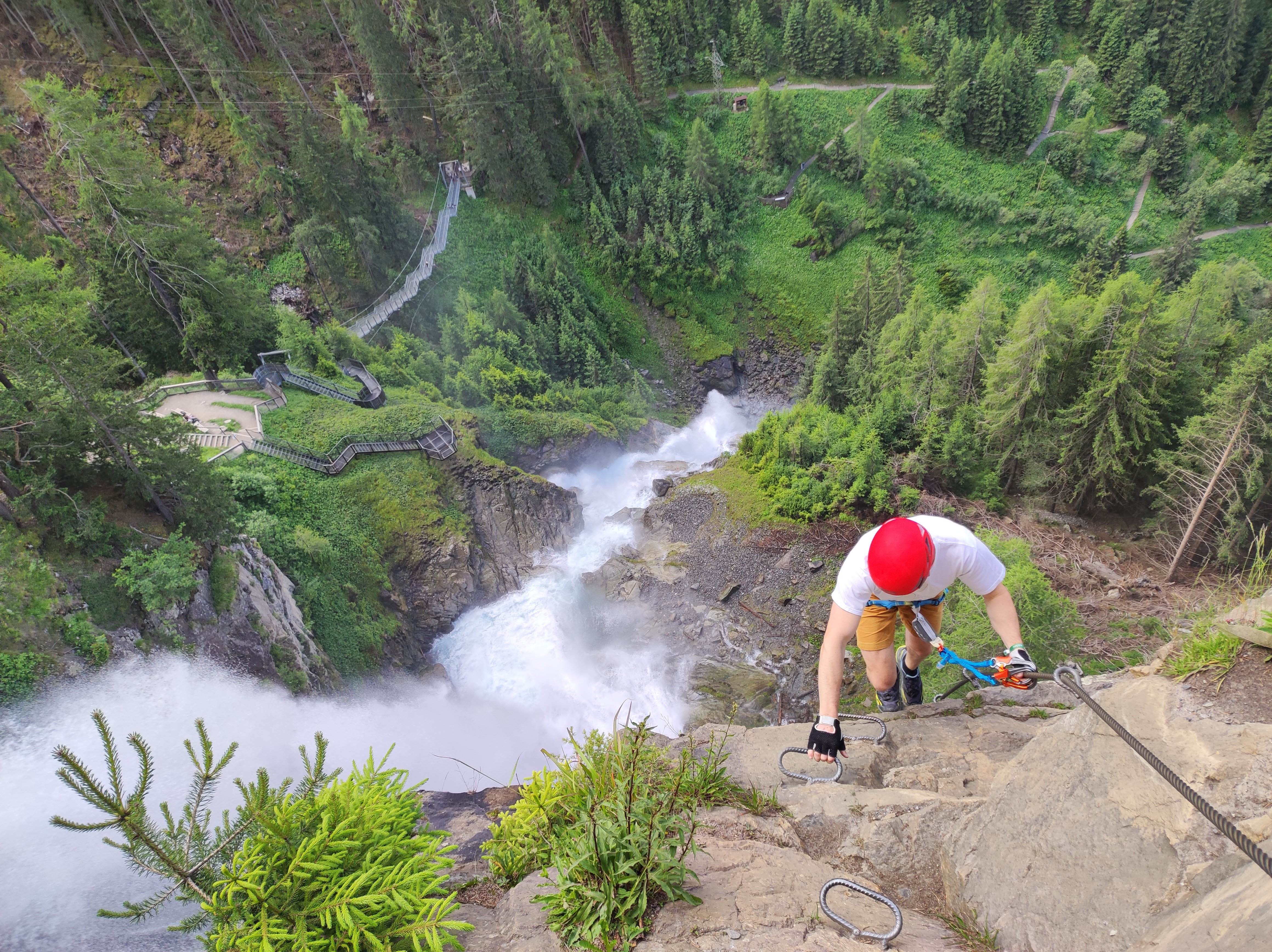 An diesem Tag waren Regenschauer ab Nachmittag gemeldet, weshalb sich die Gruppe für den Stuibenfall Klettersteig als Vormittagsprogramm entschied. Zuerst startete man vom Parkplatz den 45 minütigen Zustieg vorbei an einen Ötzidorf und neben einen strömenden Bergbach zum Fuße des Klettersteigs. Dieser kurze und schöne Klettersteig führt mitunter zwei Seilbrücken an der Westseite des Wasserfalls hinauf. Oben angekommen wurde eine Brotzeitpause eingelegt, bevor es an der anderen Seite des Wasserfalls den Normalweg mit vielen Treppenstufen und einer beeindruckenden, langen Hängebrücke hinunter und zurück zum Parkplatz ging.