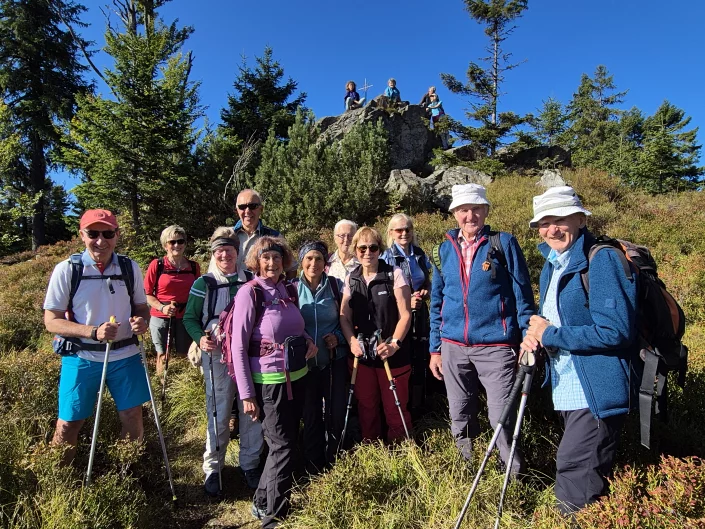 Eine stimmungsvolle Wanderung unternahmen 16 Teilnehmer, bei Traumwetter, im Bay. Wald. Mit Elfriede Niedermeier wanderte die Gruppe von Spiegelhütte, bei Zwiesel, zuerst auf einem Waldpfad, ansteigend zu einer Lichtung, dem Scheuereckriegel. Von hier wurde über den Jährlingsschachten, einer früheren Weidefläche, durch Heidelbeersträucher, hohem Gras und alten, knorrigen Bäumen zum Fuß des Scheuereckberges aufgestiegen. Nach ein paar Stufen war das kleine Gipfelkreuz auf 1200 m Höhe erreicht. Die schöne Aussicht reichte zum Falkenstein, Arber und dem tschechischen Polednik. Auf einem Wurzelweg ging es abwärts und bald wurde der Grenzübergang Gsenget nach Tschechien erreicht. Nun stand noch der Aufstieg zum Schachtenhaus auf dem Programm. Inmitten der Schachtenwiese steht das ehemalige Forsthaus auf 1150 m Höhe. Die Bänke, entlang des Hauses, luden zu einer sonnigen Rast ein. Auf einem Forstweg führte der Weg zurück zum Scheuereckriegel, und auf dem Aufstiegsweg zurück nach Spiegelhütte. Eine Einkehr bei der Broudl Stube in Lindbergmühle, rundete den schönen Bergtag ab.
