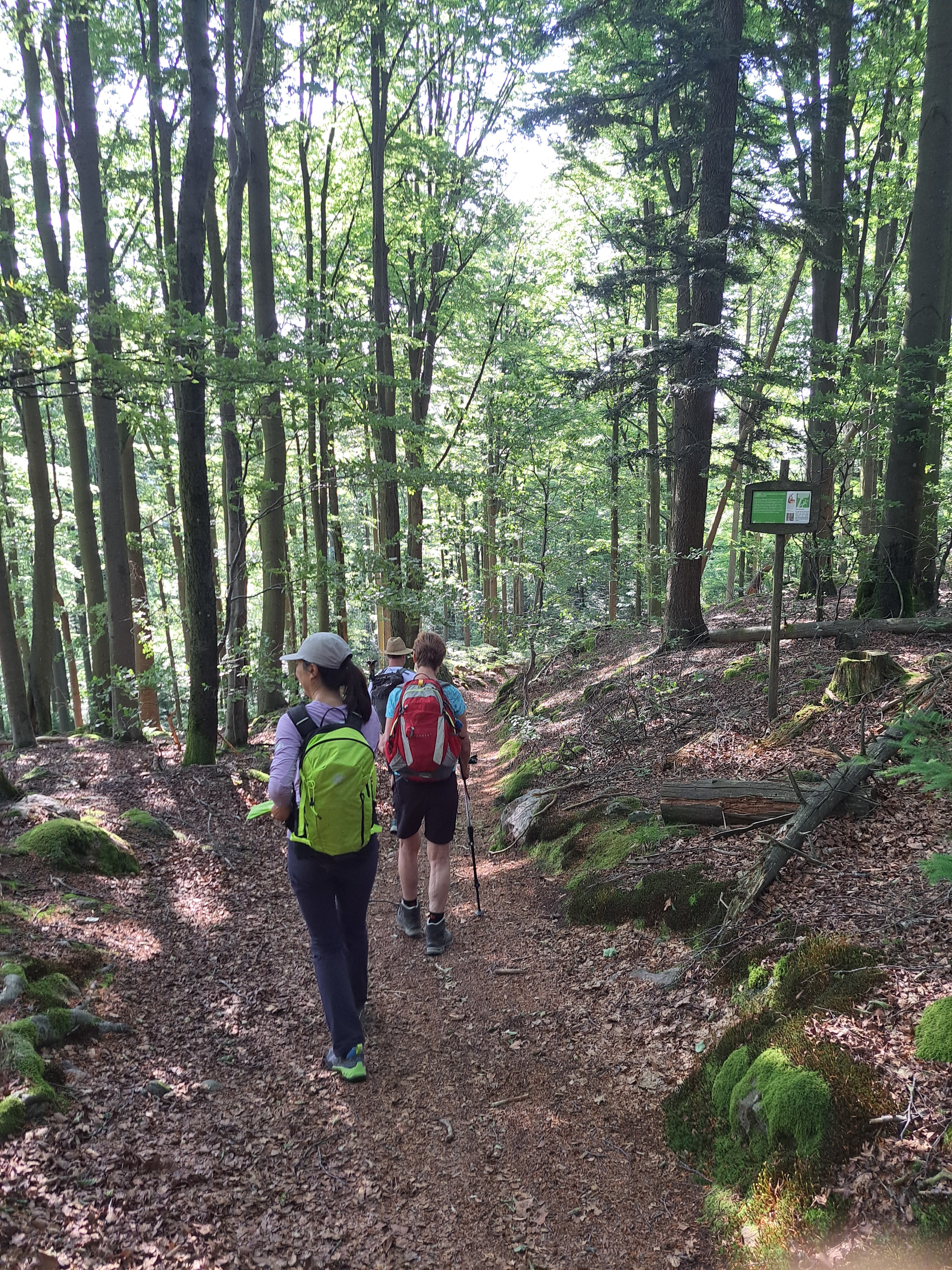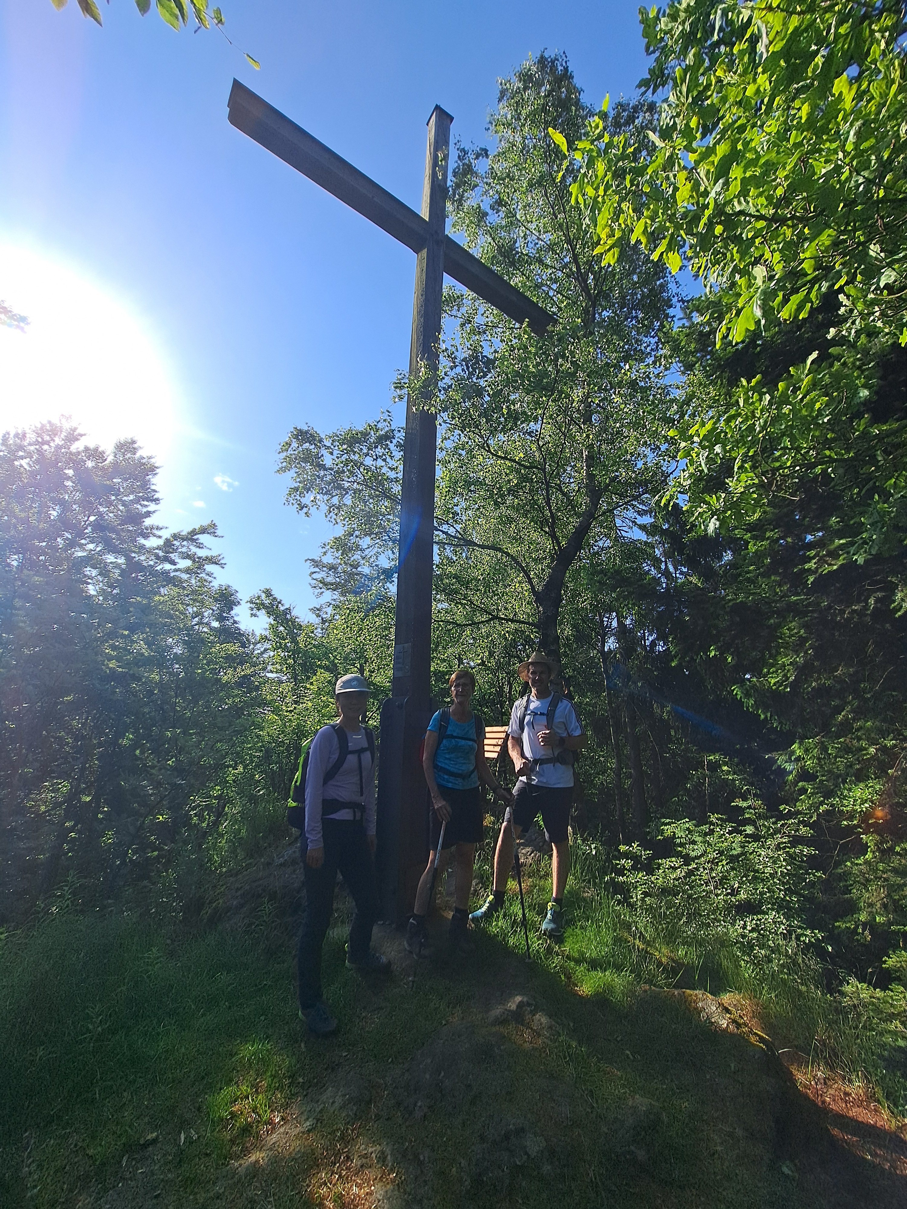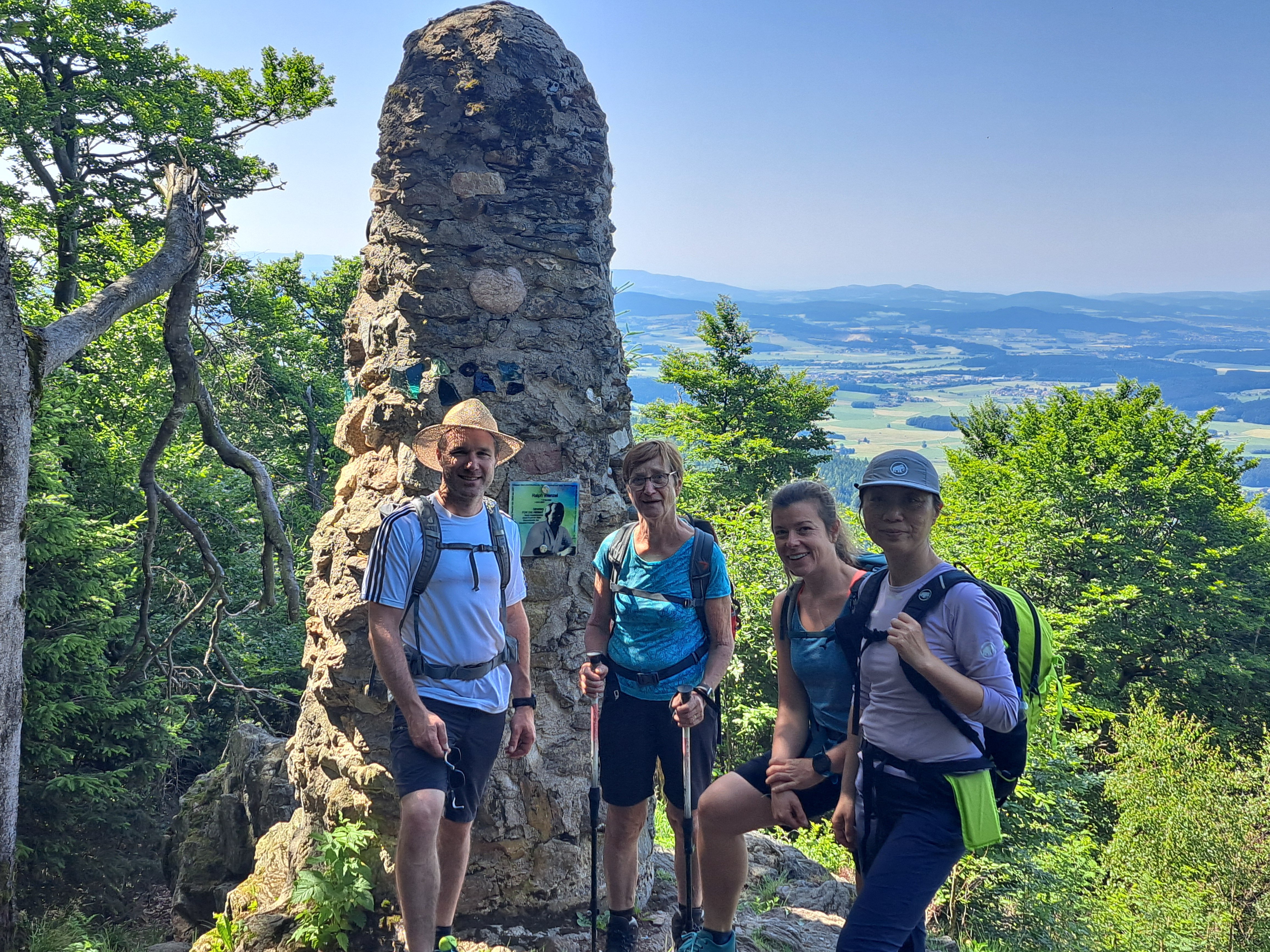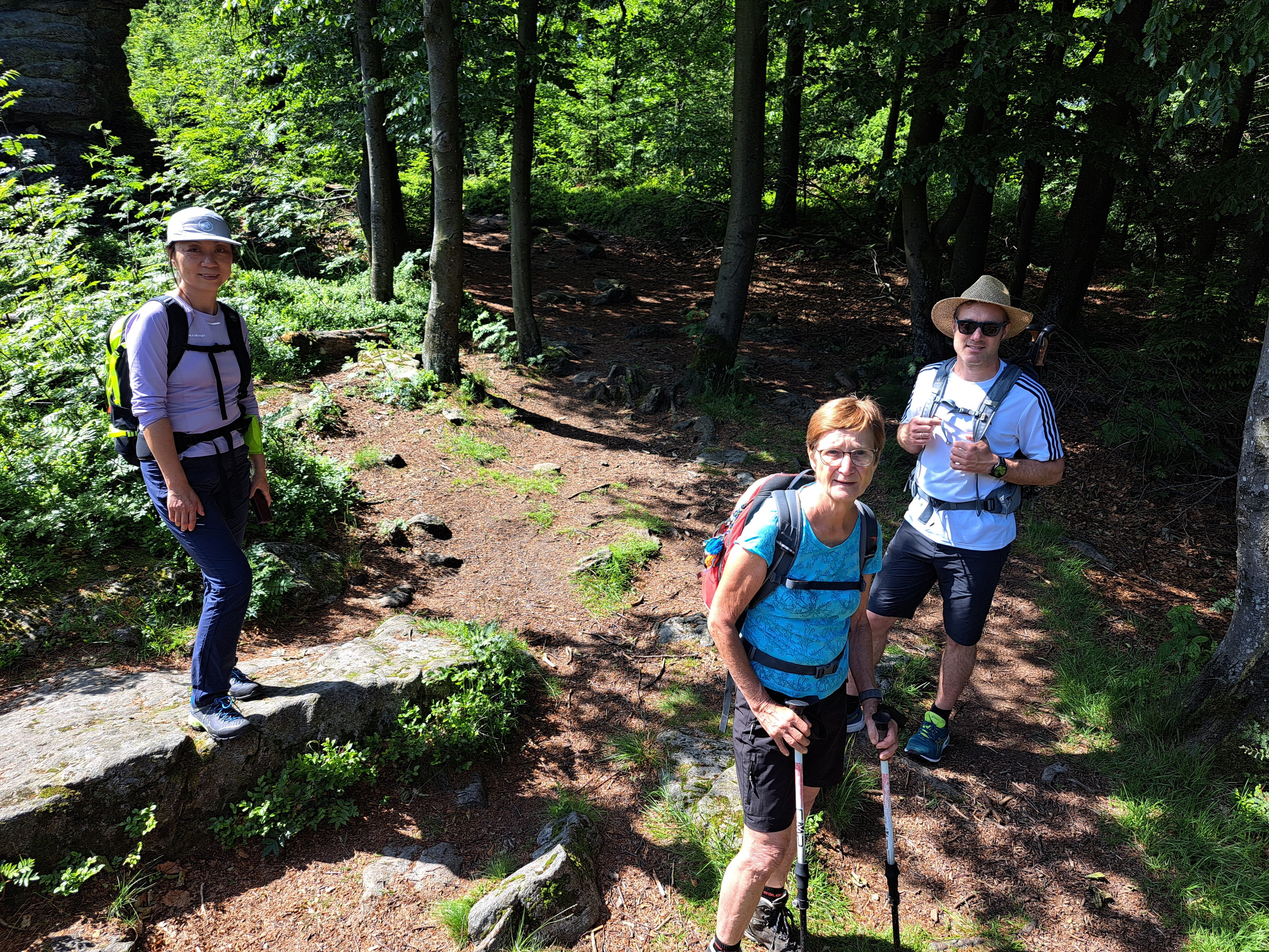Vom Parkplatz Oberherzogau ging es für die Teilnehmer der DAV Sektion Pfarrkirchen auf eine lange, abwechslungsreiche und doch auch fordernde Tour. Extra früh gestartet, da der Wettergott es gut meinte und der Tag Temperaturen von über 30 Grad versprach, wanderten die Bergfexe über den Klammerfelsen, nach Althütte, über den Pfenningfelsen und Kreuzfelsen zum Gibacht weiter zum Reiseck. Hier machten die Teilnehmer an der Bergwachthütte mit herrlichem Blick auf Furth im Wald eine ausgedehnte Gipfelrast. Gleich darauf ging es weiter Richtung Voithenberg und dann noch etliche Höhenmeter bergauf zum Dachsriegel und Burgstall und wieder zurück zum Parkplatz nach Oberherzogau. Was für ein grandioser Tag mit wunderbaren Ausblicken, idyllischen Plätzen in der Ruhe der Natur. Trotz Pfingstferien war hier wenig los. Auf dem Rückweg nach Pfarrkirchen ging es noch in Cham in die Wasserwirtschaft auf ein kühles Getränk. Insgesamt legten die Teilnehmer 23,5 km und über 1.100 hm zurück.