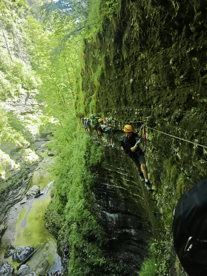 Mit viel Sonnenschein im Gepäck, nach mehreren Wochen trüben Wetter, war die Vorfreude auf der Hinfahrt deutlich spürbar. Am Parkplatz angekommen, noch schnell die Ausrüstung gepackt, ging es über den kurzen Zustieg schon über das erste Hindernis. Eine wacklige Angelegenheit merkten wir schnell, doch die Hängebrücke wurde mit viel staundenden Blicken in die Klamm überwunden. Der Klettersteig schlängelt sich durch die Klamm in einer beachtlichen Höhe, von links nach rechts. Ein weiteres Hilight war zugleich eine Mutprobe, der Gattsprung. Hier mussten die Jugendlichen über den reißenden Bach springen (natürlich gesichert). Die Gruppe teilte sich nach der Wasserfallbrücke kurz auf, ein Teil kletterte weiter am Wasser entlang, während die Anderen die etwas schwieriger Karstquellwand bezwangen.