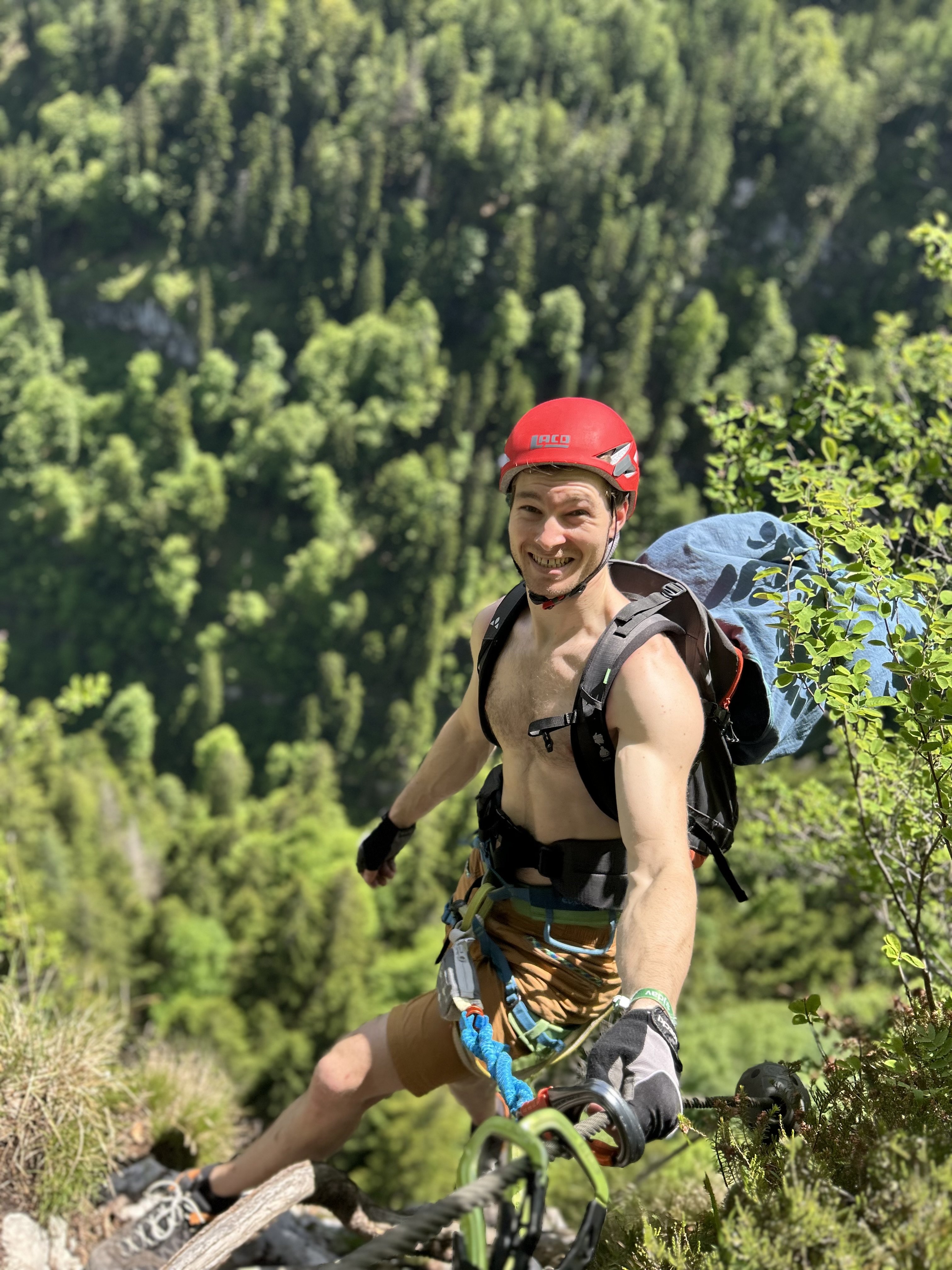 An der malerischen großen Badewanne legten wir eine kurze Pause ein bevor es zum krönenden Abschluss an die schwierigste Stelle des Klettersteiges ging, die Gamsleckenwand. Bei leuchtender Felsenwand galt es teilweise im Überhang einige Schlüsselstellen zu überwinden, bevor man die herrliche Aussicht genießen konnte.