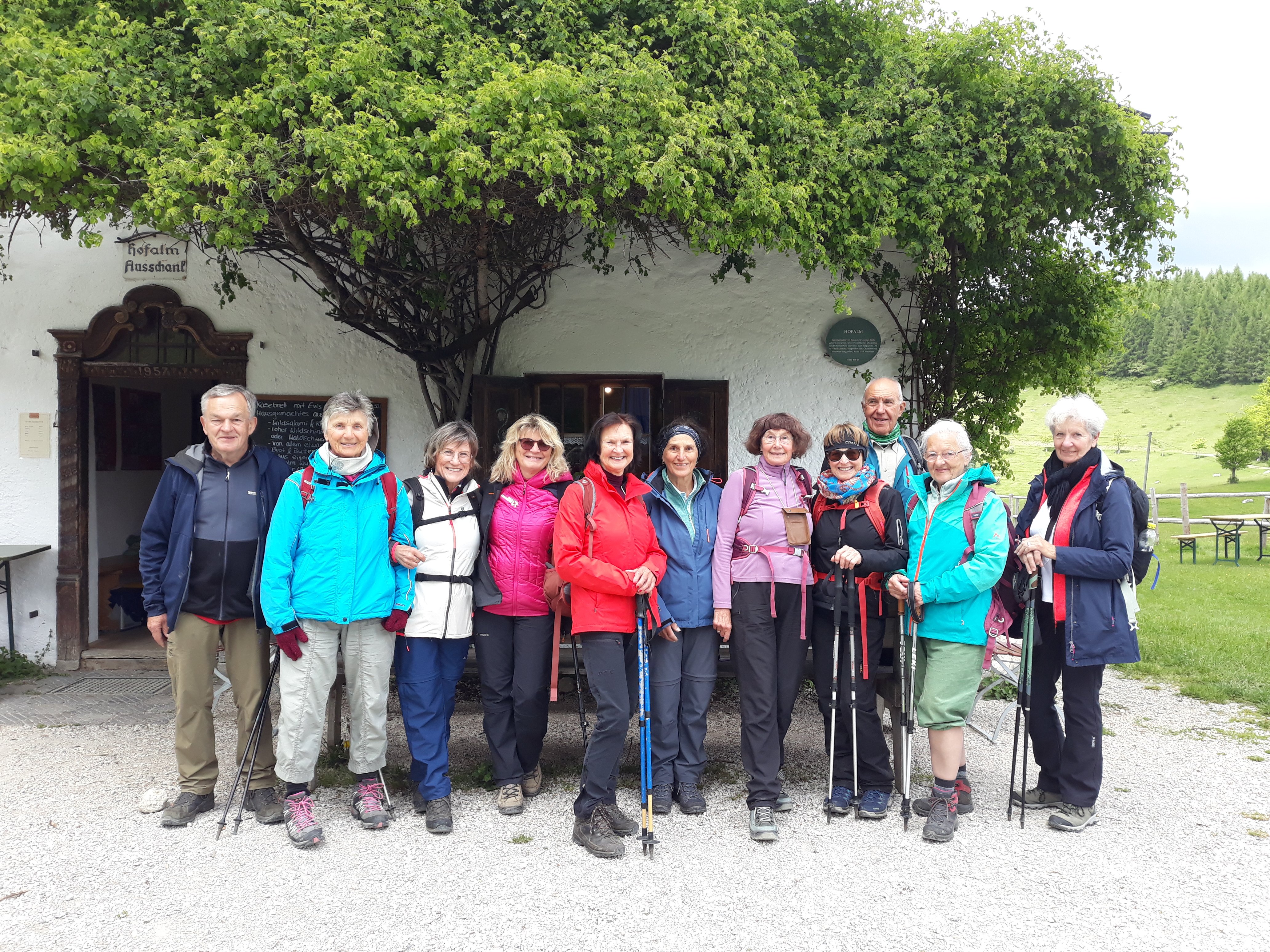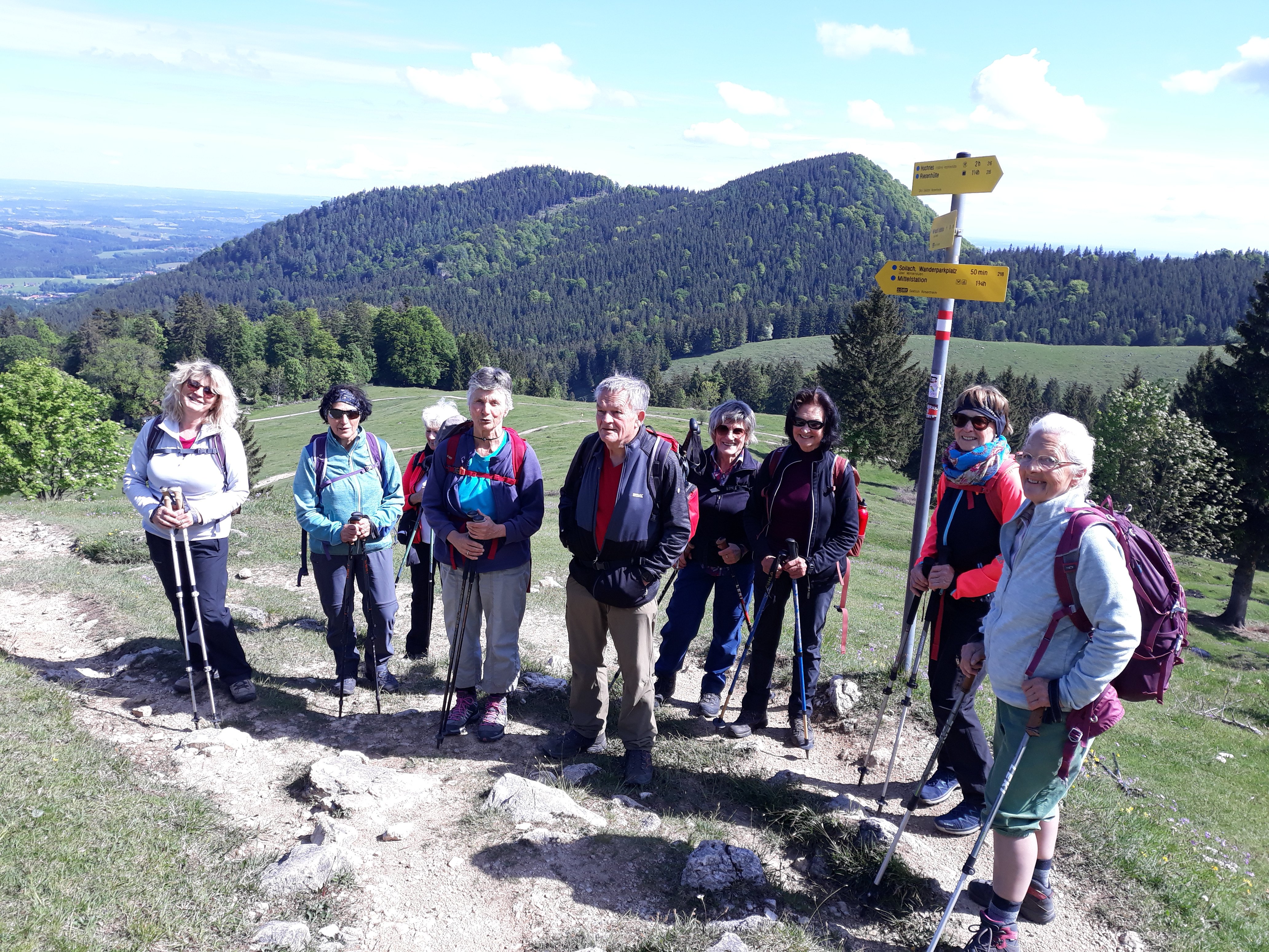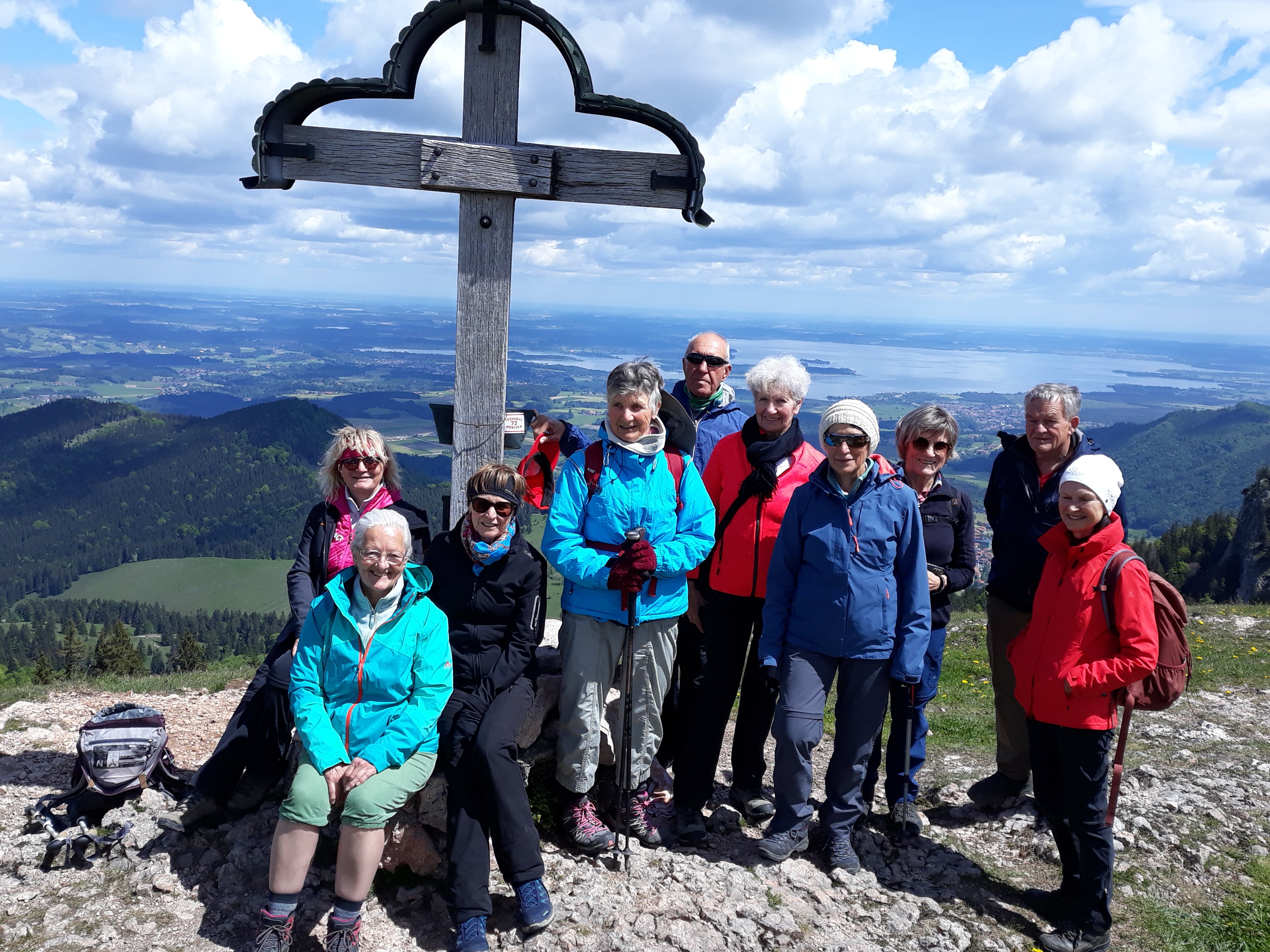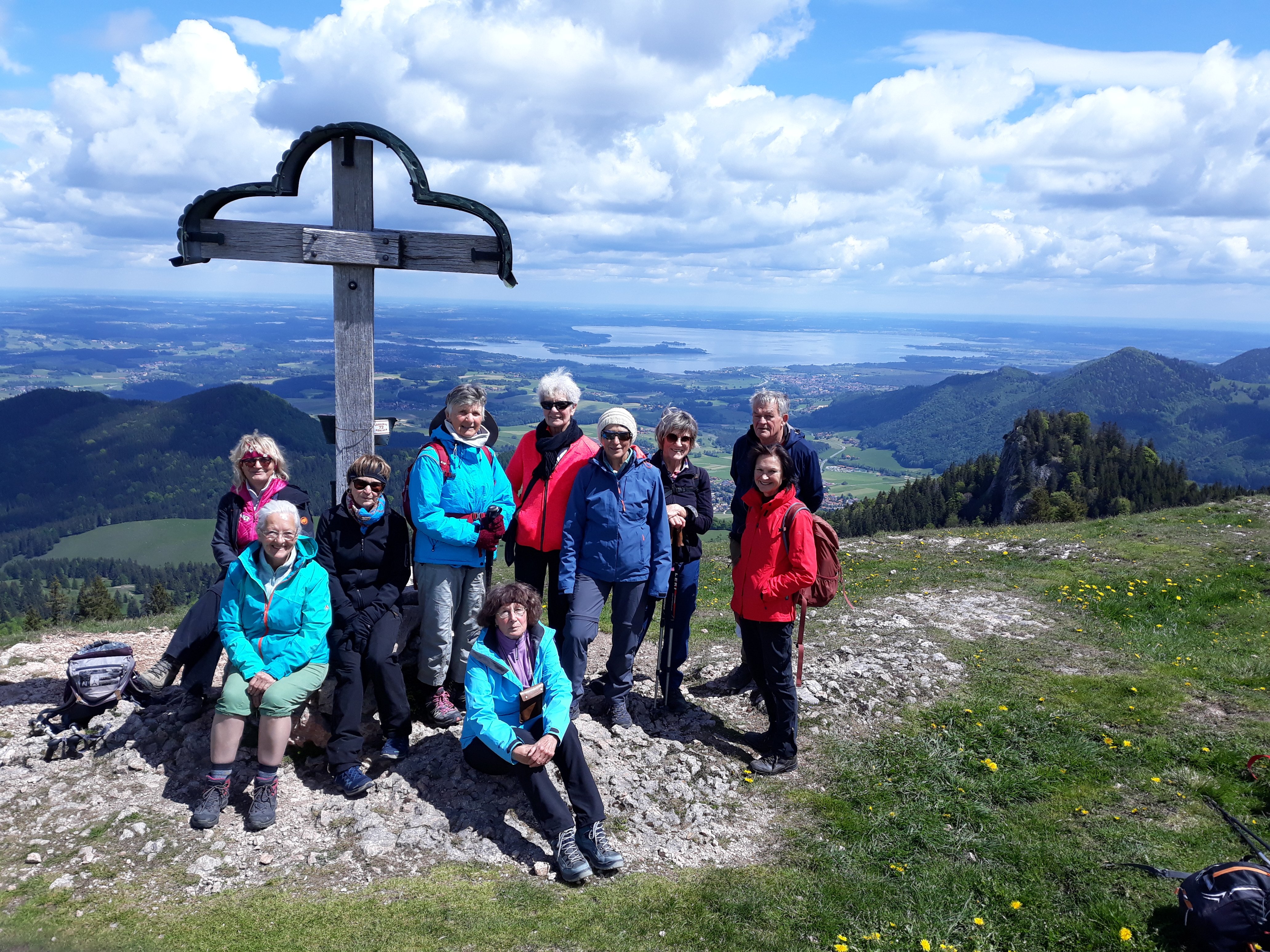 Eine Wanderung im Chiemgau führte 11 Alpenvereinsmitglieder auf den 1350 m hohen Laubenstein. Mit Elfriede Niedermeier wanderte die Gruppe von Frasdorf/Lederstube zuerst auf einer Forststraße. Ab einer kleinen Kapelle ging es über bunte Almwiesen , mit leuchtet pinken Primeln. Über teils steile Waldsteige führte der Weg zum Gatterl und über die Laubenstein Almen hinauf zum Gipfel. Hier bot sich ein herrlicher Ausblick auf den Chiemsee, die Kampenwand und viele Berggipfel. Eine ausgiebige Brotzeit, bei leichtem Wind, und vielen Fotomotiven, fand beim Gipfelkreuz statt. Auf der Almwiese leuchteten die vielen Enziane in ihrem satten blau. Der Abstiegsweg führte noch zur Hofalm, wo eine Kaffeepause eingelegt wurde. Über die Forststraße ging es zurück zum Ausgangspunkt.