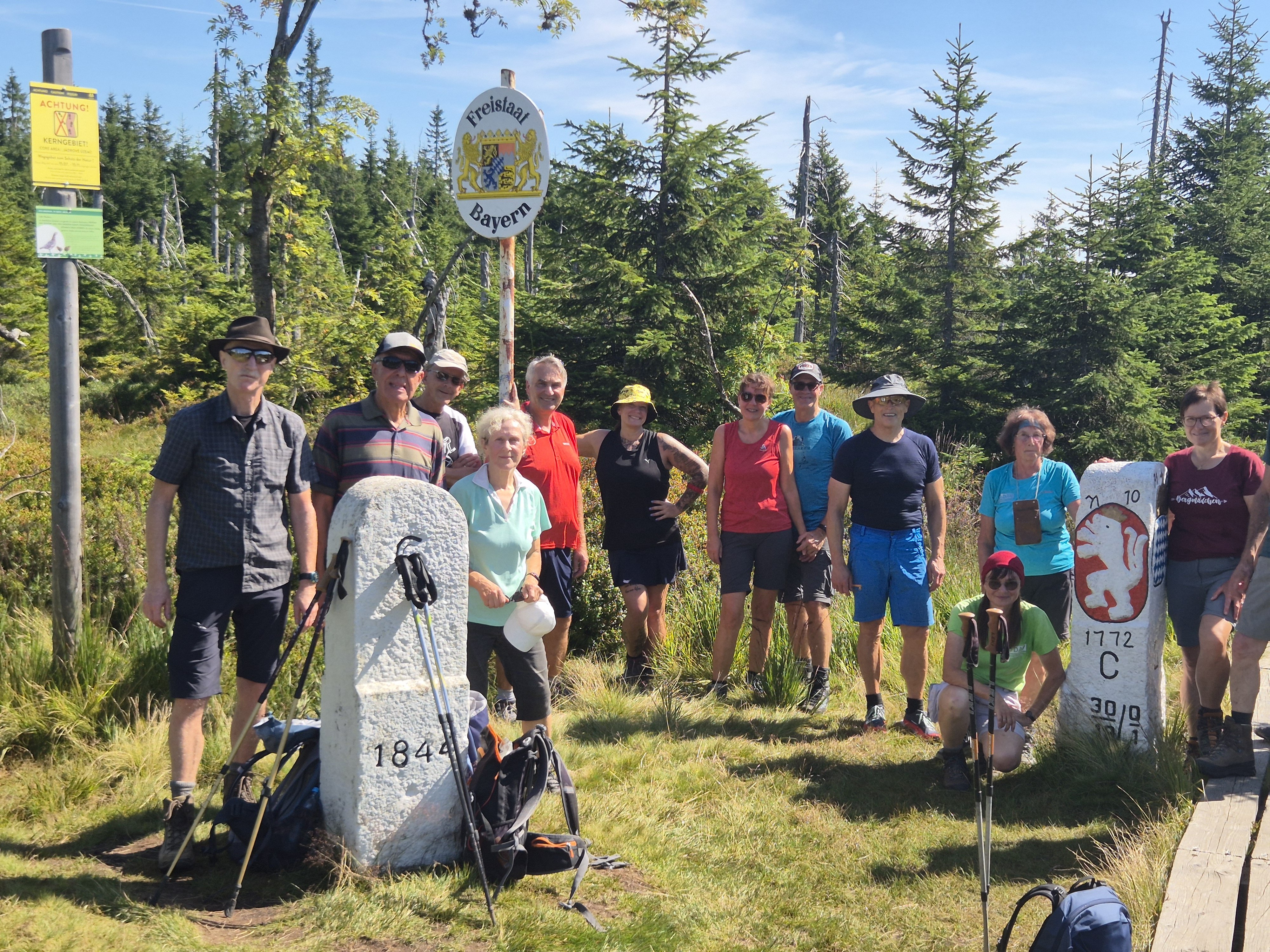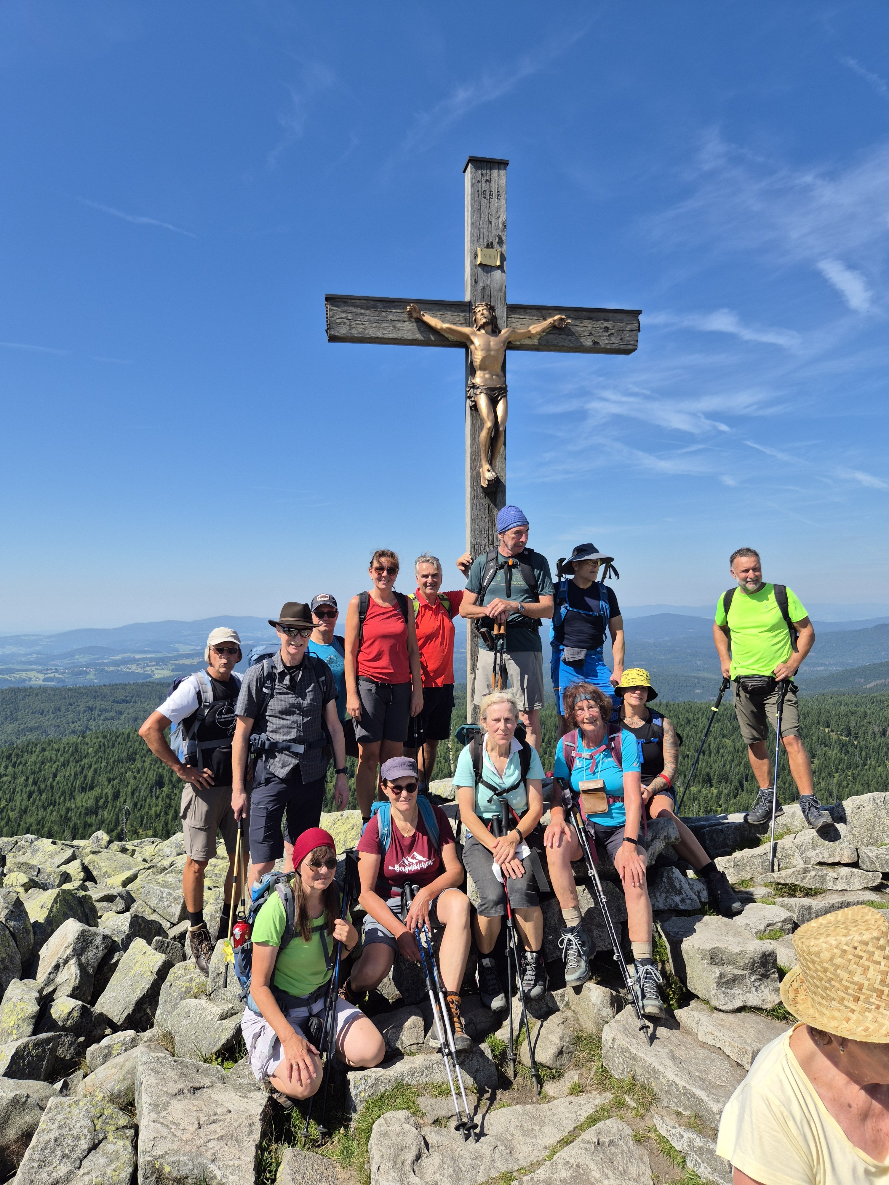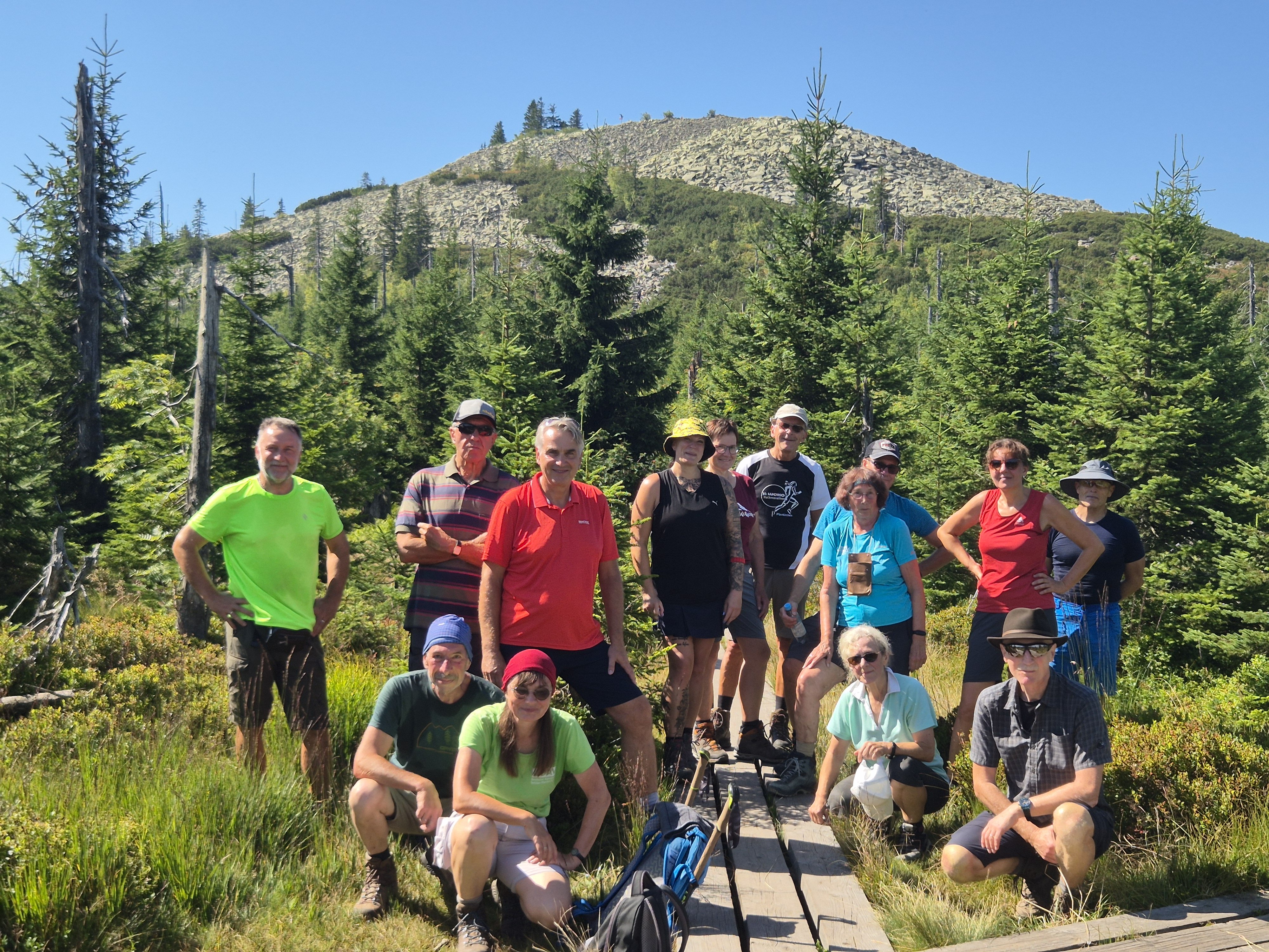 Eine etwas andere Tour auf den Lusen 1373 m unternahmen 14 Wanderer mit Elfriede Niedermeier. Ausgehend von der Schwarzbachbrücke bei Finsterau, ging es anfangs am Schwarzbach entlang auf Bohlen durch den Wald. Weiter auf dem Finsterauer Lusensteig, gesäumt von Farn, Gräsern und Heidelbeerbüschen, auf eine Lichtung, dem Marktfleckl. Hier markiert ein Stein, unterhalb des Lusengipfels, die Grenze zwischen Bayern und Böhmen. Nach kurzer Rast wanderte die Gruppe über Blockgestein zum Gipfel des Lusen, mit seinem typischen Blockmeer. Nachdem auf dem ganzen Aufstiegsweg nur wenige Wanderer unterwegs waren, war es um den Gipfel herum schon gut gefüllt. Nach kurzer Rast mit Rundumsicht, war nach kurzem Abstieg schon das Lusenschutzhaus erreicht. Auf dem Weiterweg, kurz entlang auf dem bequemen Hüttenzustieg , wurde der Weg Richtung Tummelplatz eingeschlagen. Hier waren die Wanderer wieder alleine unterwegs. Auf dem schmalen, ebenen Pfad, entlang des Sulzriegelhangs, mit einigen Schlammstellen, wurde der Tummelplatz, mit seinem großen Forsthaus erreicht. Als Zuckerl führte Elfriede Niedermeier die Gruppe noch auf einem "Wilden Pfad" durch allerlei Gestrüpp und umgestürzte Bäume, auf den Aussichtsbalkon des Sulzriegels, den Hochgfeichtetstein 1260 m. Viele Heidelbeersträucher luden zum Naschen ein. Zurück am Tummelplatz unternahmen die Wanderer noch einen kurzen Aufstieg zum Großalmeyerschloß. Eine Felsenkanzel mit Holzkreuz und Aussicht. Nach der aussichtsreichen Tour, auf meist unbekannten Wegen, wurde über den Brunndoblweg zur Schwarzbachbrücke abgestiegen.