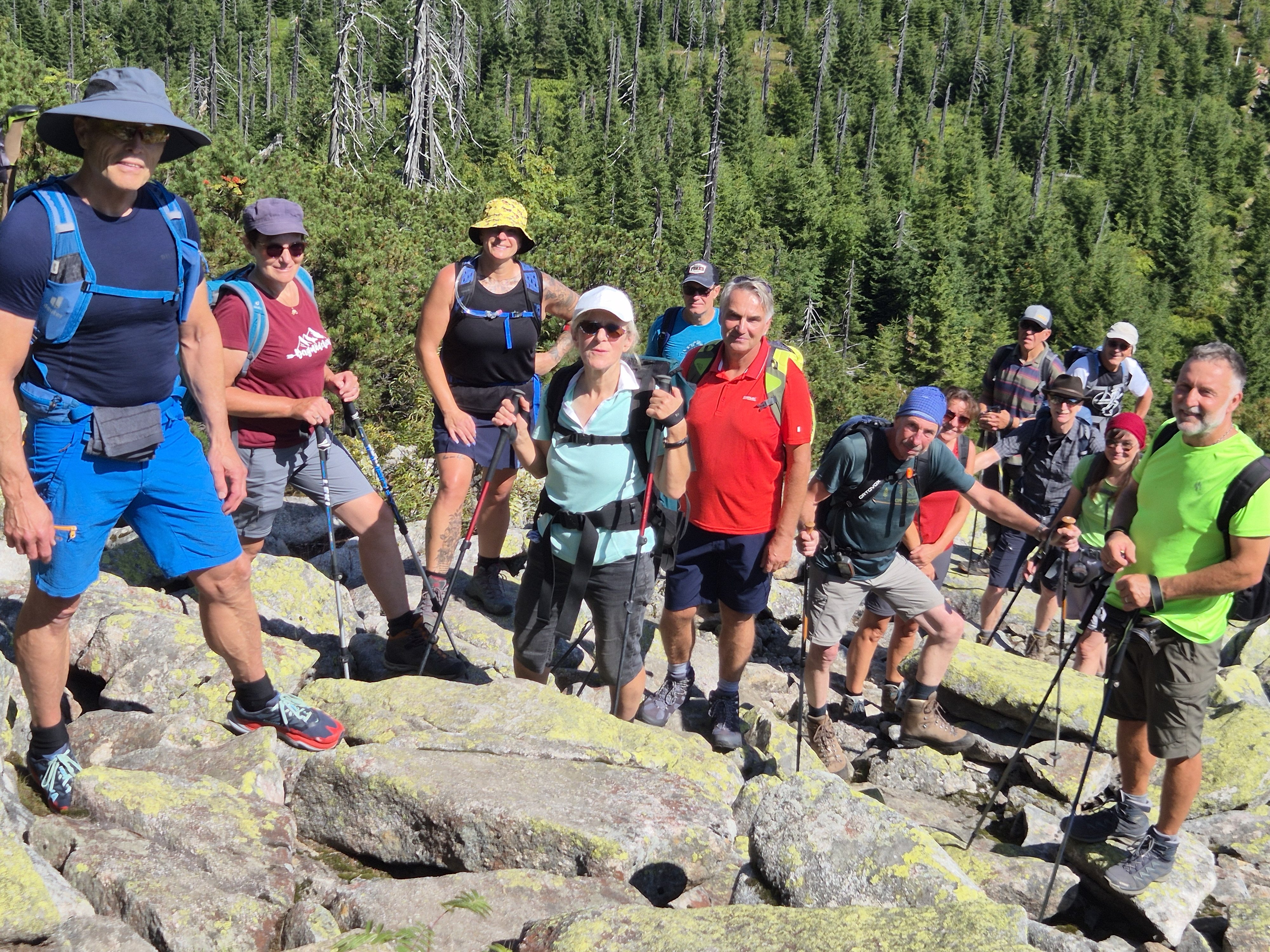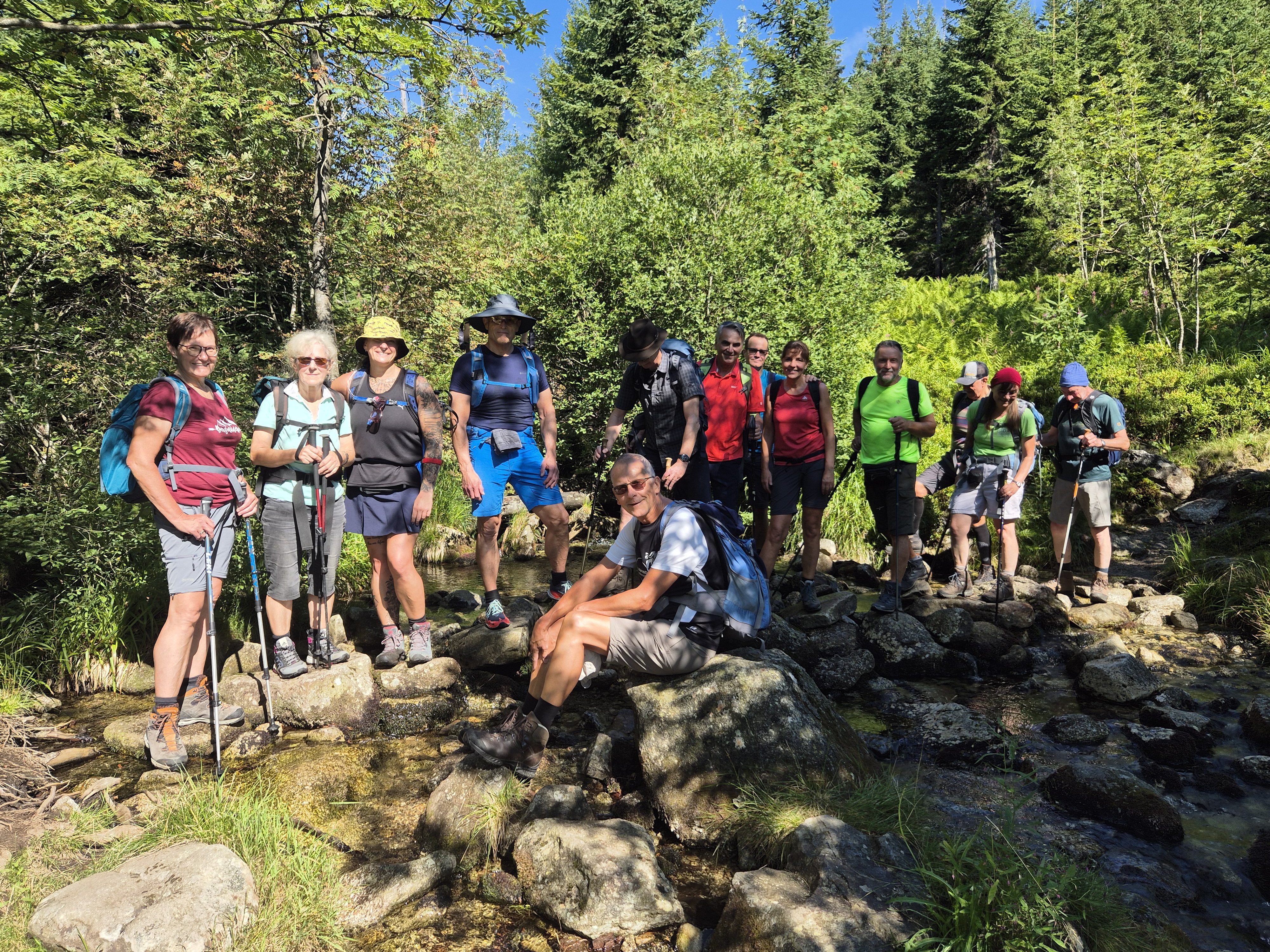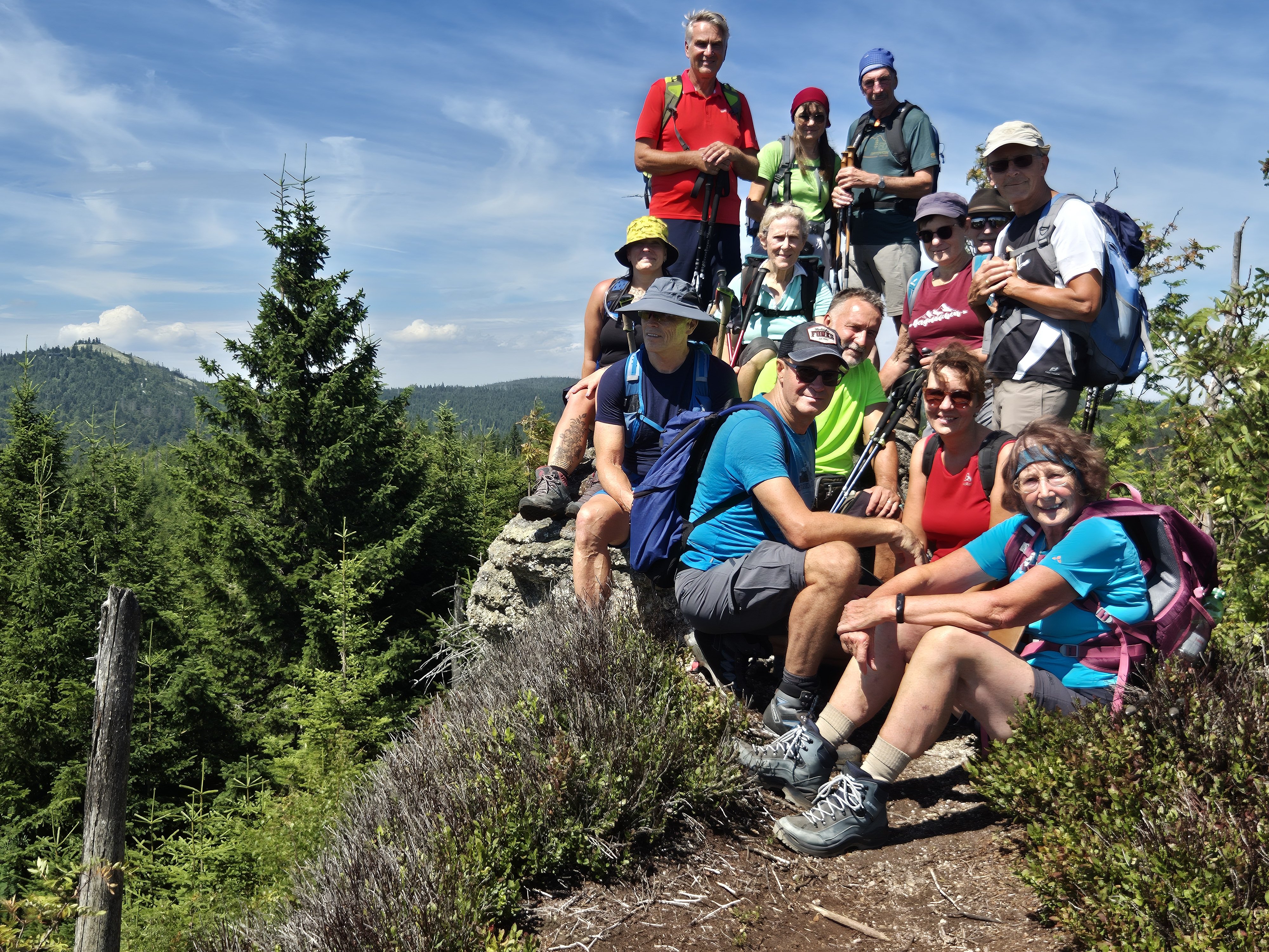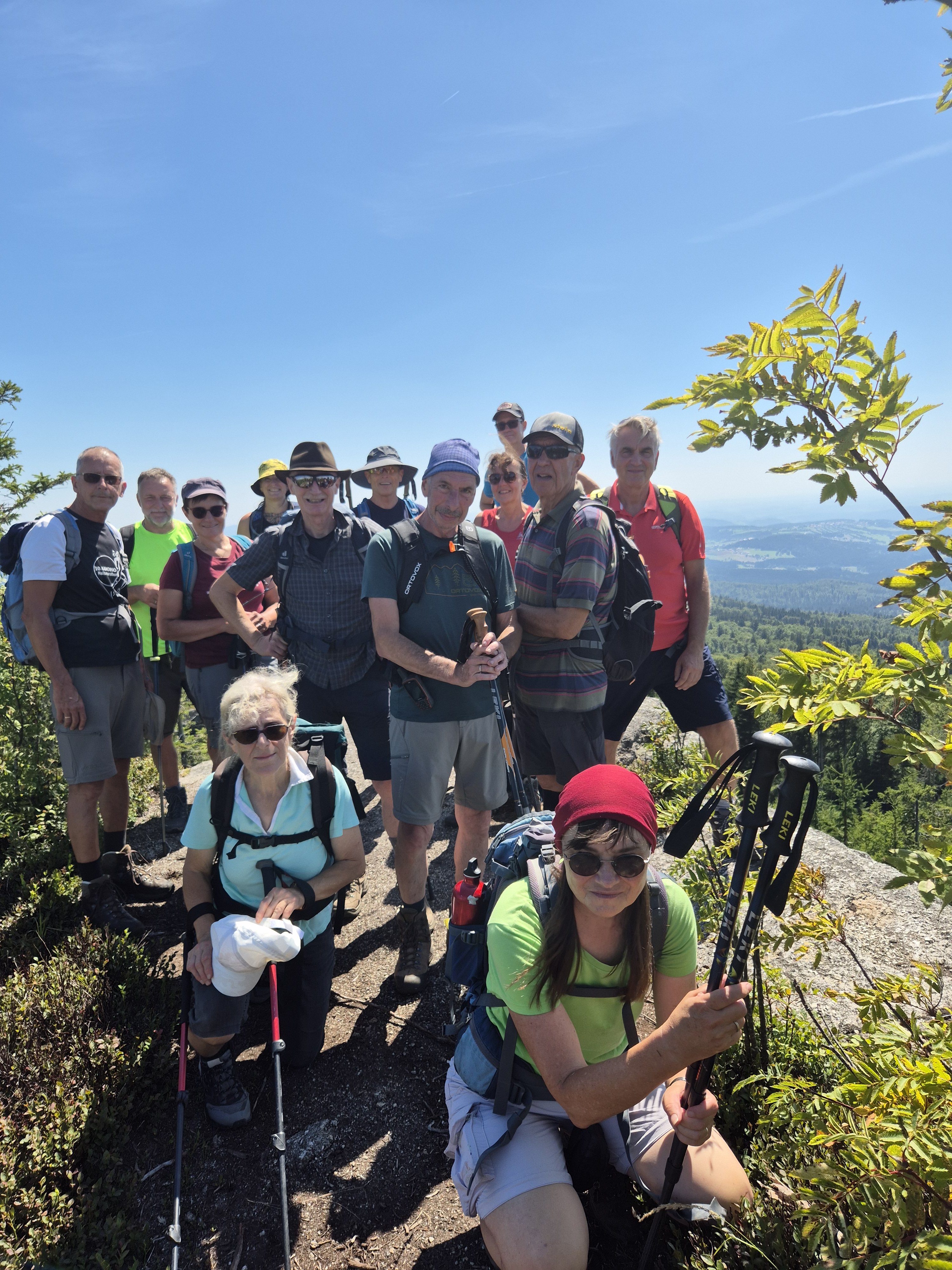 Eine etwas andere Tour auf den Lusen 1373 m unternahmen 14 Wanderer mit Elfriede Niedermeier. Ausgehend von der Schwarzbachbrücke bei Finsterau, ging es anfangs am Schwarzbach entlang auf Bohlen durch den Wald. Weiter auf dem Finsterauer Lusensteig, gesäumt von Farn, Gräsern und Heidelbeerbüschen, auf eine Lichtung, dem Marktfleckl. Hier markiert ein Stein, unterhalb des Lusengipfels, die Grenze zwischen Bayern und Böhmen. Nach kurzer Rast wanderte die Gruppe über Blockgestein zum Gipfel des Lusen, mit seinem typischen Blockmeer. Nachdem auf dem ganzen Aufstiegsweg nur wenige Wanderer unterwegs waren, war es um den Gipfel herum schon gut gefüllt. Nach kurzer Rast mit Rundumsicht, war nach kurzem Abstieg schon das Lusenschutzhaus erreicht. Auf dem Weiterweg, kurz entlang auf dem bequemen Hüttenzustieg , wurde der Weg Richtung Tummelplatz eingeschlagen. Hier waren die Wanderer wieder alleine unterwegs. Auf dem schmalen, ebenen Pfad, entlang des Sulzriegelhangs, mit einigen Schlammstellen, wurde der Tummelplatz, mit seinem großen Forsthaus erreicht. Als Zuckerl führte Elfriede Niedermeier die Gruppe noch auf einem "Wilden Pfad" durch allerlei Gestrüpp und umgestürzte Bäume, auf den Aussichtsbalkon des Sulzriegels, den Hochgfeichtetstein 1260 m. Viele Heidelbeersträucher luden zum Naschen ein. Zurück am Tummelplatz unternahmen die Wanderer noch einen kurzen Aufstieg zum Großalmeyerschloß. Eine Felsenkanzel mit Holzkreuz und Aussicht. Nach der aussichtsreichen Tour, auf meist unbekannten Wegen, wurde über den Brunndoblweg zur Schwarzbachbrücke abgestiegen.