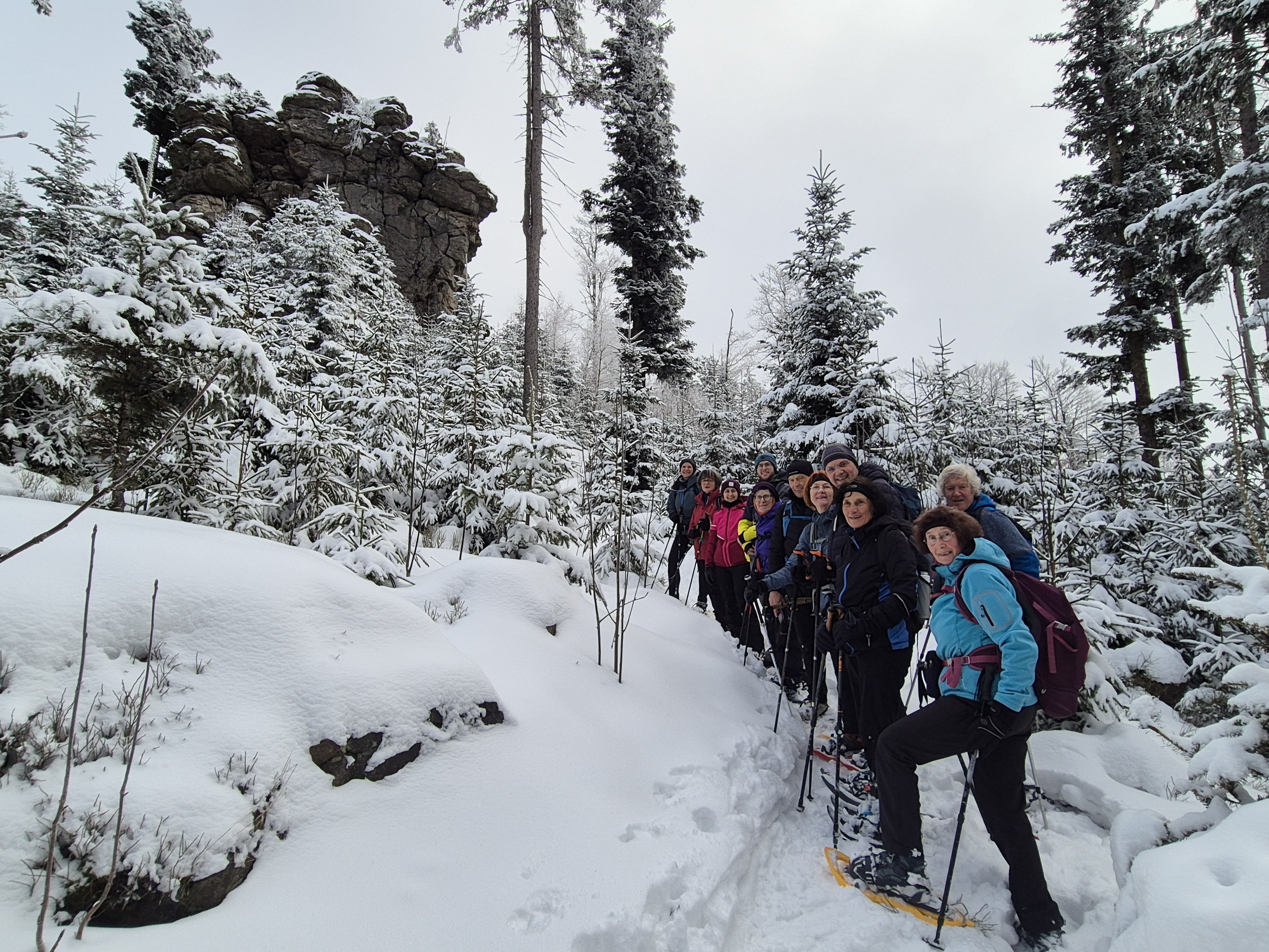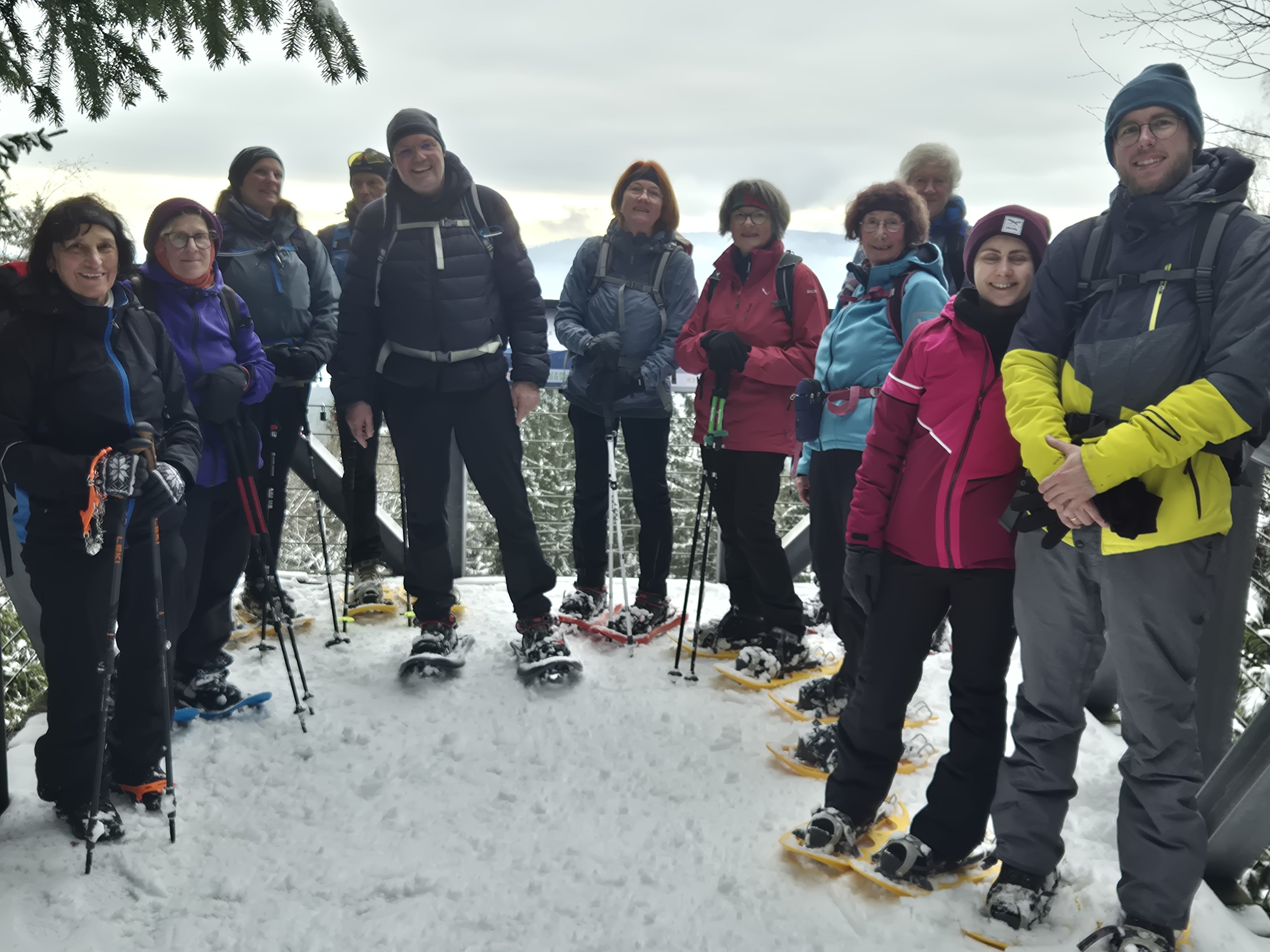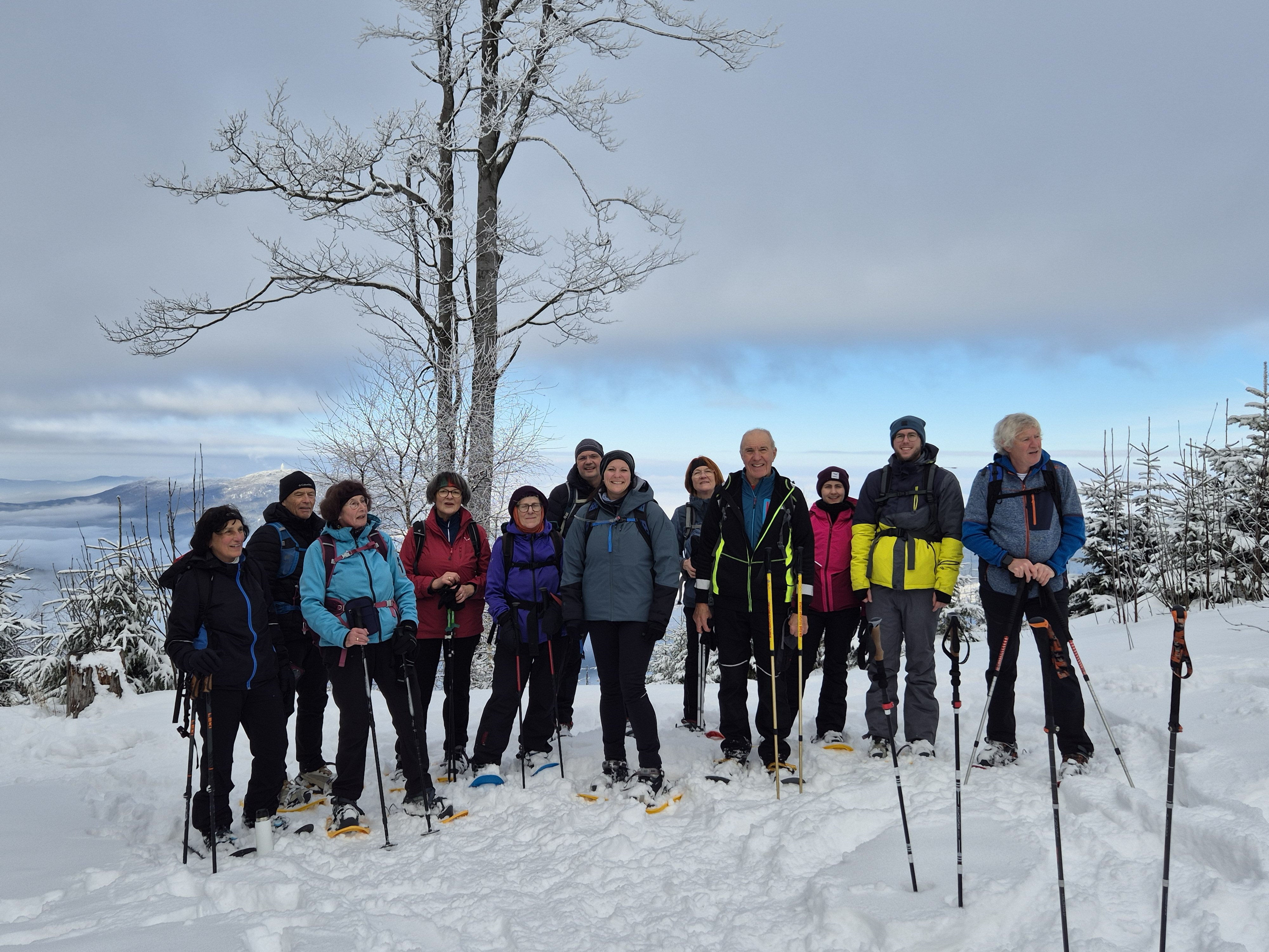 Eine Alpenvereinstour führte 12 Teilnehmer nach Eck bei Arnbruck. Neuschnee verwandelte den Bay. Wald in ein "Winterwunderland". In Eck wurden die Schneeschuhe angeschnallt und die Gruppe wanderte , mit Elfriede Niedermeier, im tief verschneiten Wald, zum Mühlriegel hinauf. Natürlich wurde auch zum Gipfelkreuz 1080 m aufgestiegen. Der freie Blick reichte bis zu den Alpen. Nach kurzer Pause ging es Richtung Ödriegel. Hier mußte steil auf einem Waldpfad aufgestiegen werden. Oben angekommen, präsentierten sich die Felsen der Ödriegel 1156 m. Auf einen, der freistehenden Felsen, kletterten auch einige Wanderer und genossen die herrliche Aussicht. Die Sicht reichte nach Arrach und Lam, sowie die Höhen vom Hohen Bogen und Osser. Der Schnee auf dem Höhenweg wurde immer tiefer und so bahnten sich die Schneeschuhgeher den Weg durch den Pulverschnee zum Waldwiesmartel. Nach kurzer Rast mußte der Abstieg wieder selbst gespurt werden. Auf einer Forststraße, mit Langlaufspur, wurde wieder Richtung Mühlriegel aufgestiegen, bevor es nochmals ins Gelände ging. Auf dem steilen Pfad, war Trittsicherheit gefragt. Dann ging es entspannt zum Skywalk, mit Tiefblick ins Zellertal. Bald schloß sich dann die Runde und die Wanderer erreichten wieder Eck. Gemütlich endete die Tour im Berggasthof Eck.