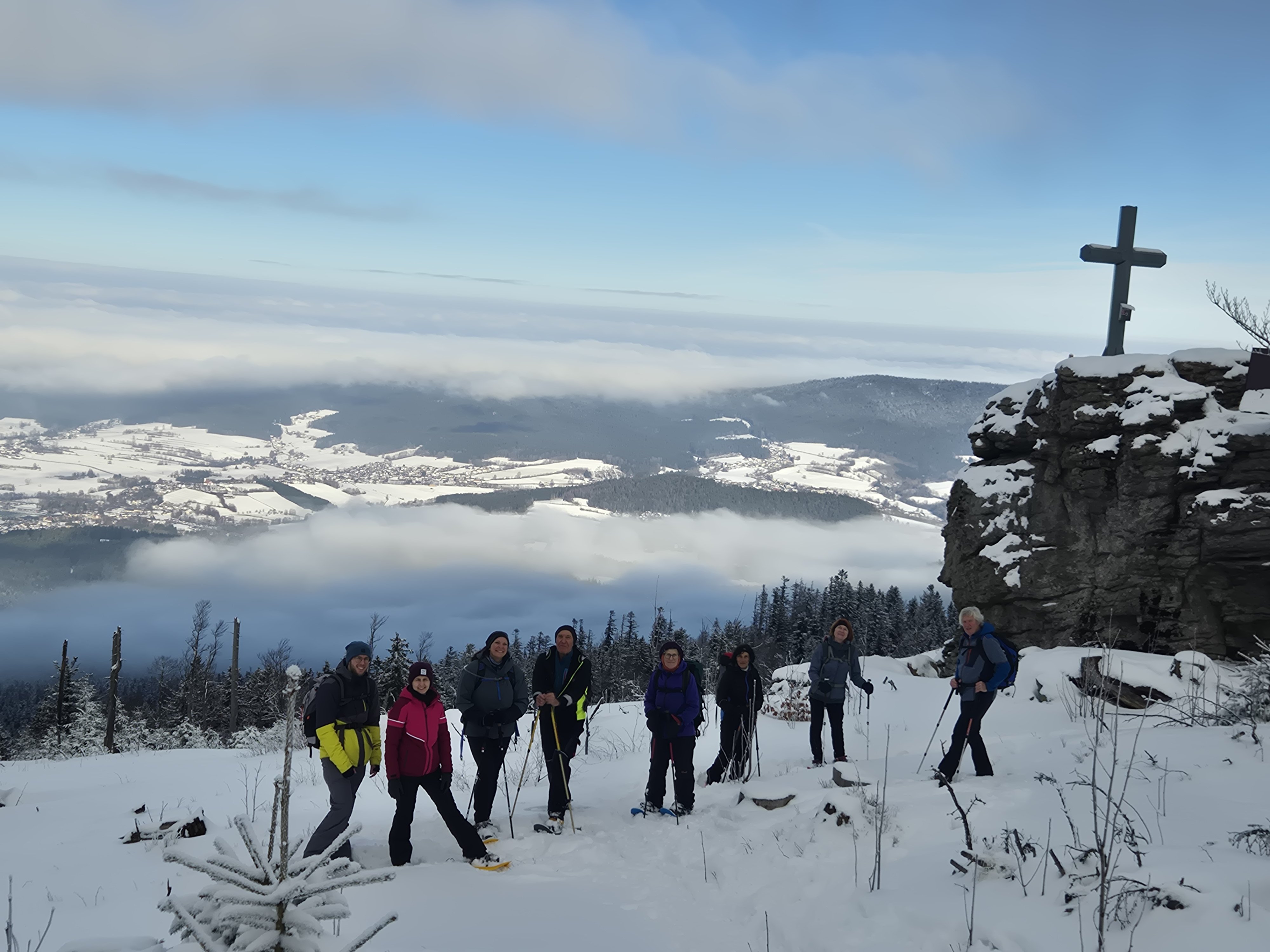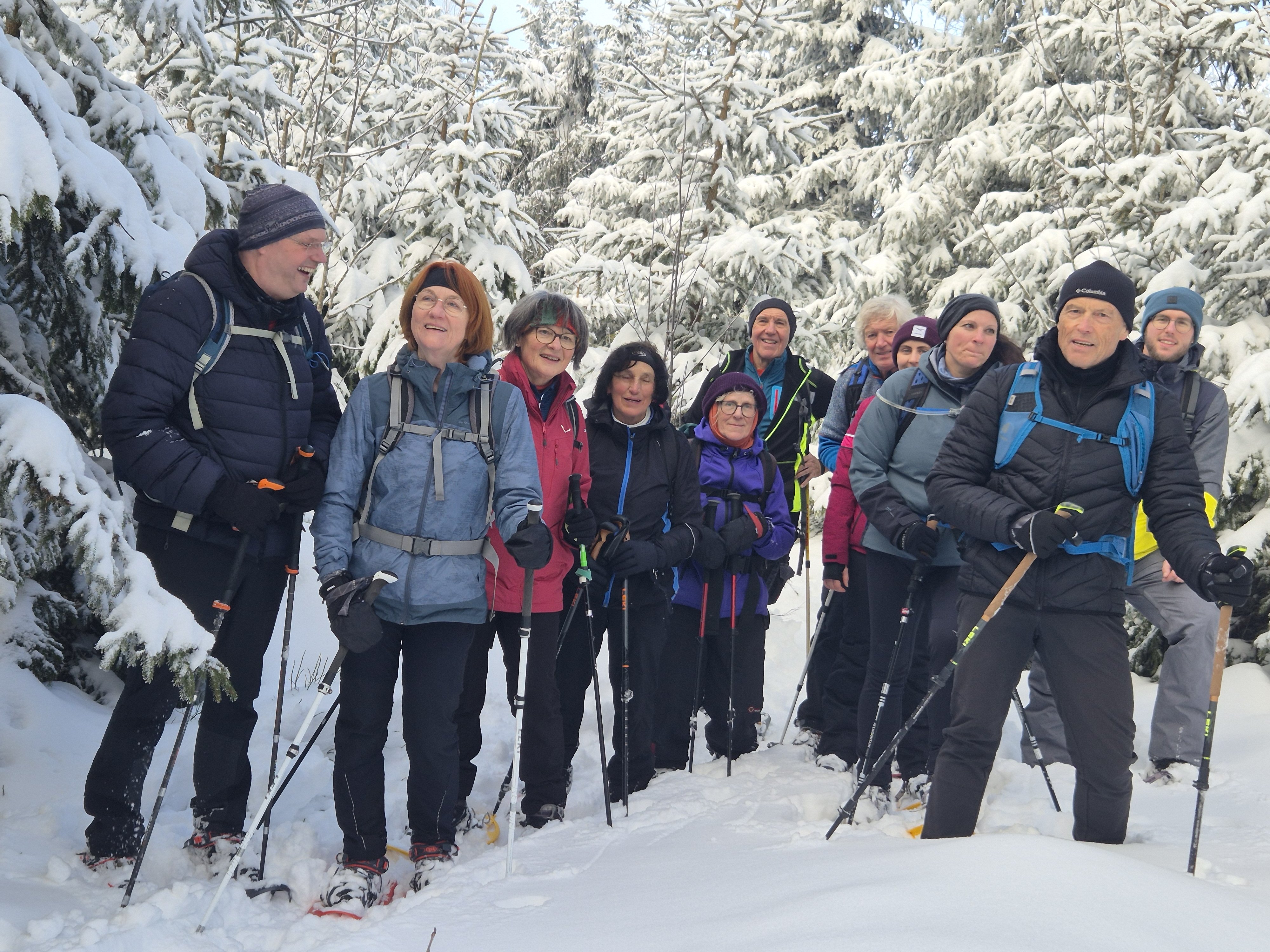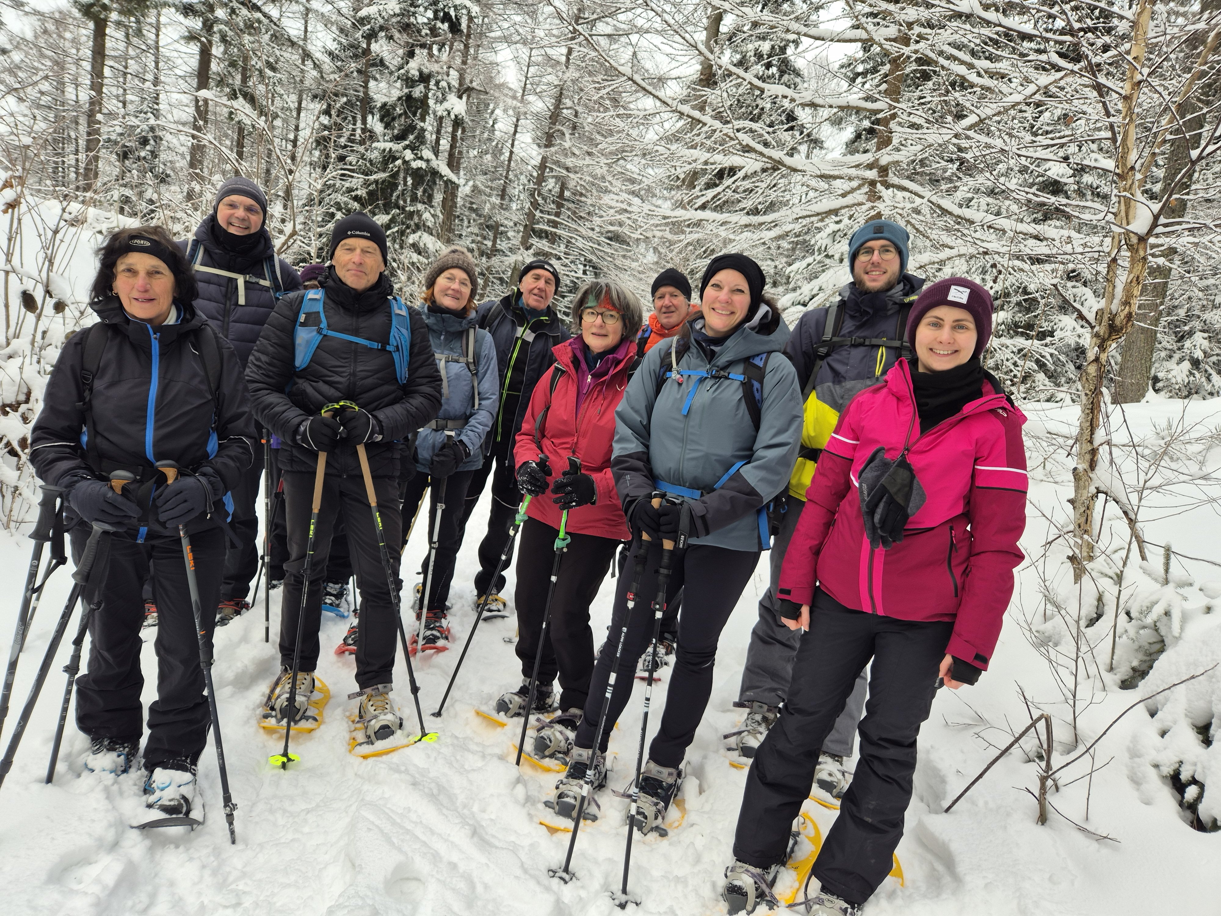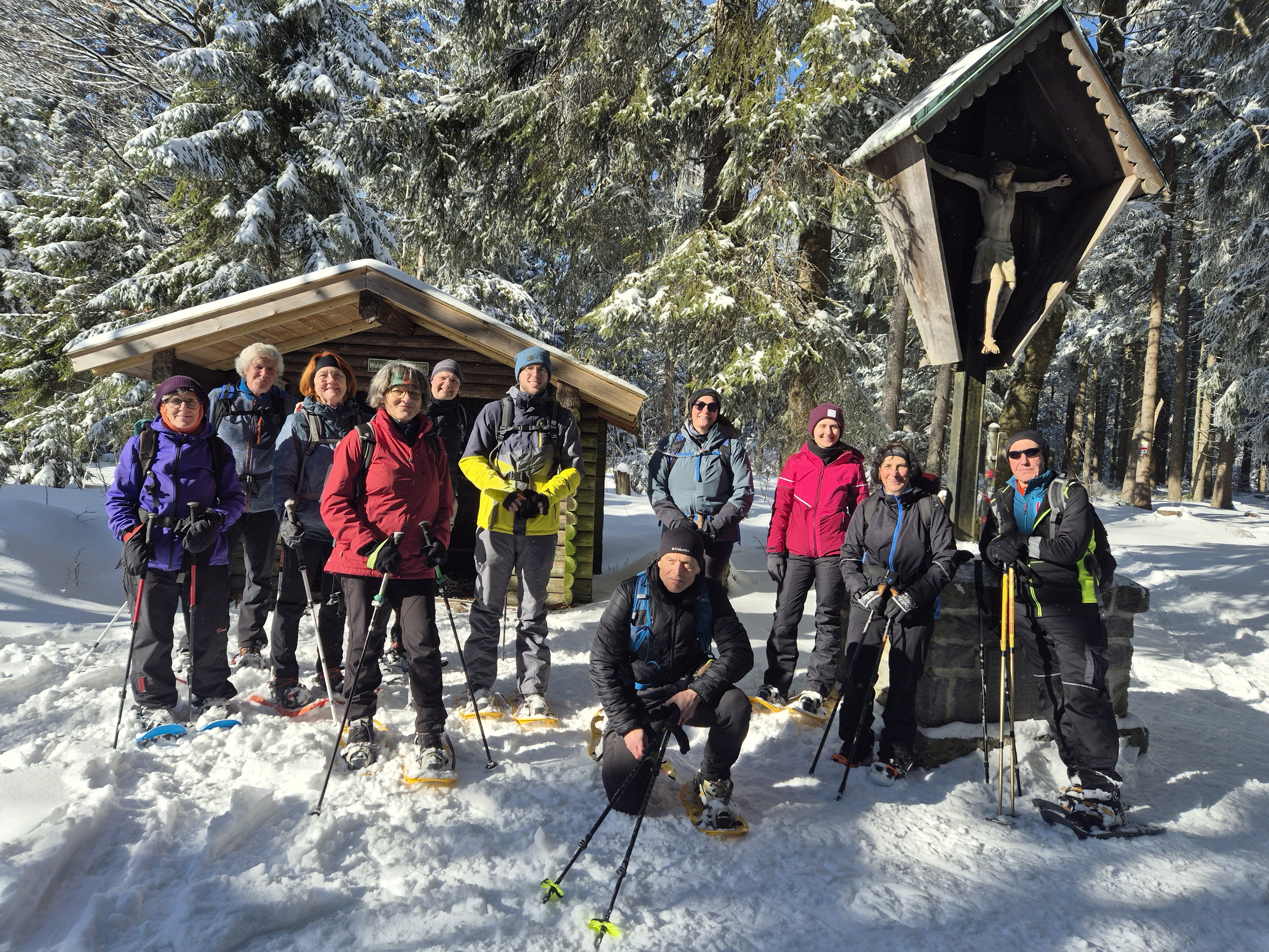 Eine Alpenvereinstour führte 12 Teilnehmer nach Eck bei Arnbruck. Neuschnee verwandelte den Bay. Wald in ein "Winterwunderland". In Eck wurden die Schneeschuhe angeschnallt und die Gruppe wanderte , mit Elfriede Niedermeier, im tief verschneiten Wald, zum Mühlriegel hinauf. Natürlich wurde auch zum Gipfelkreuz 1080 m aufgestiegen. Der freie Blick reichte bis zu den Alpen. Nach kurzer Pause ging es Richtung Ödriegel. Hier mußte steil auf einem Waldpfad aufgestiegen werden. Oben angekommen, präsentierten sich die Felsen der Ödriegel 1156 m. Auf einen, der freistehenden Felsen, kletterten auch einige Wanderer und genossen die herrliche Aussicht. Die Sicht reichte nach Arrach und Lam, sowie die Höhen vom Hohen Bogen und Osser. Der Schnee auf dem Höhenweg wurde immer tiefer und so bahnten sich die Schneeschuhgeher den Weg durch den Pulverschnee zum Waldwiesmartel. Nach kurzer Rast mußte der Abstieg wieder selbst gespurt werden. Auf einer Forststraße, mit Langlaufspur, wurde wieder Richtung Mühlriegel aufgestiegen, bevor es nochmals ins Gelände ging. Auf dem steilen Pfad, war Trittsicherheit gefragt. Dann ging es entspannt zum Skywalk, mit Tiefblick ins Zellertal. Bald schloß sich dann die Runde und die Wanderer erreichten wieder Eck. Gemütlich endete die Tour im Berggasthof Eck.