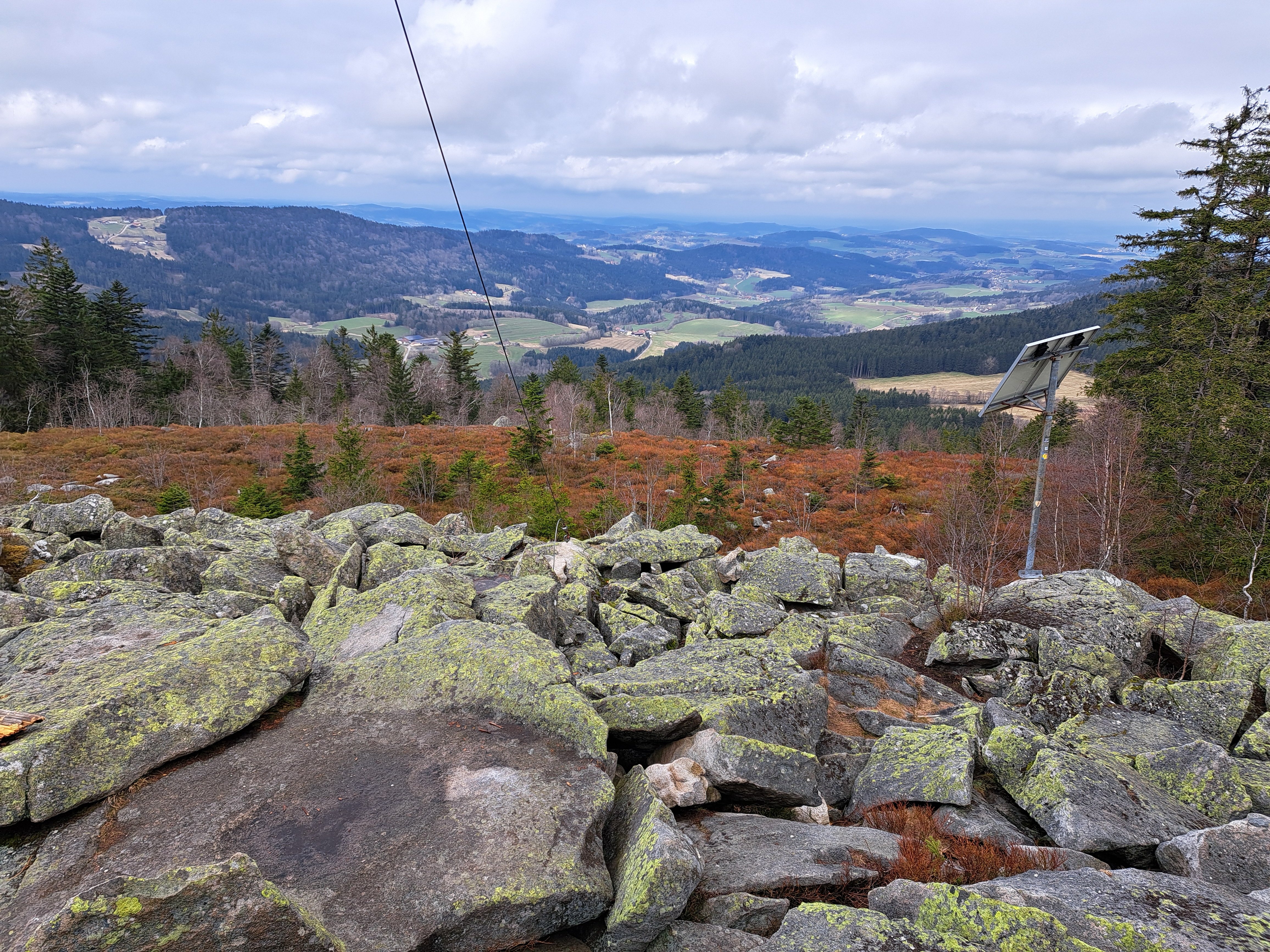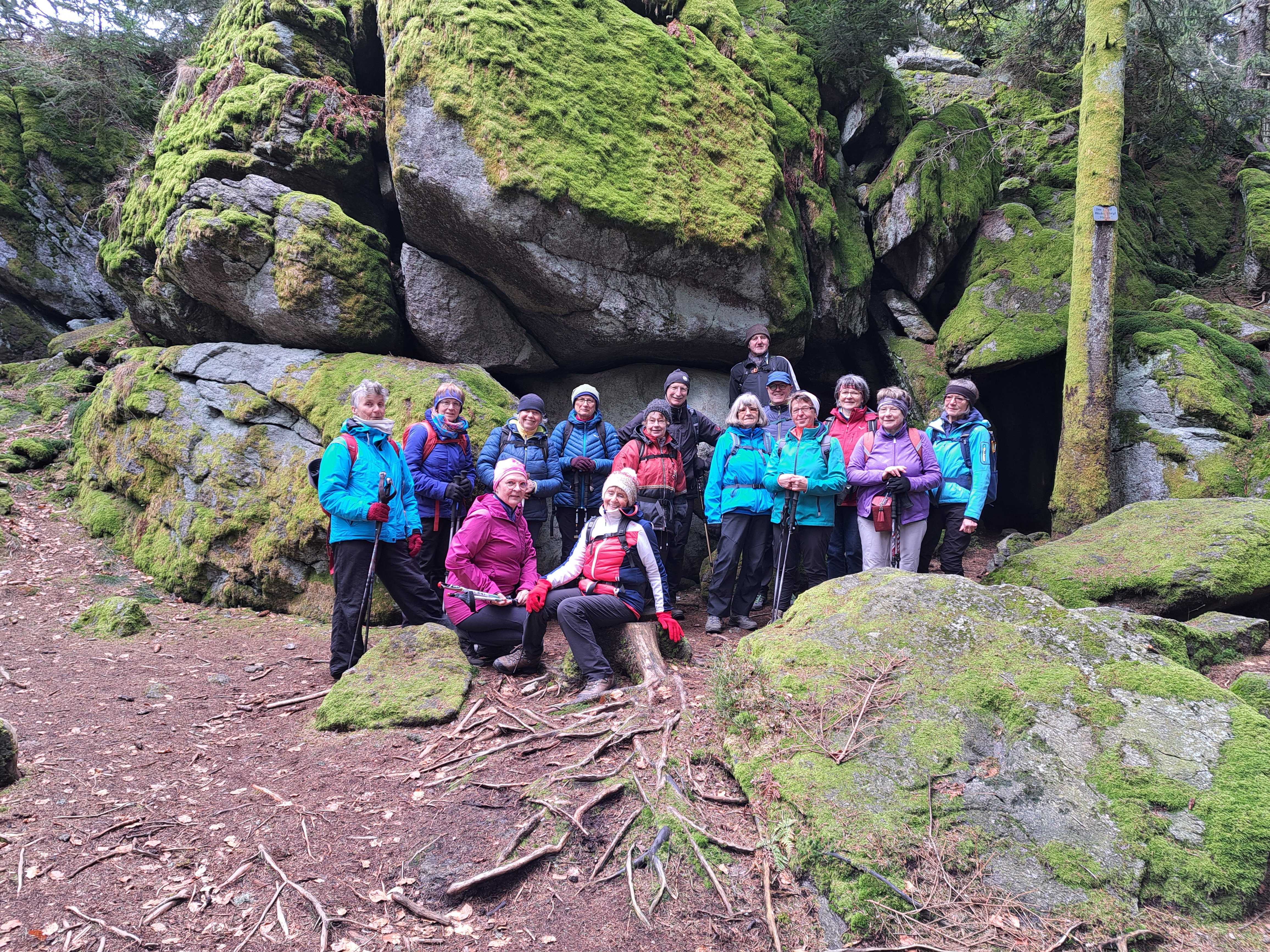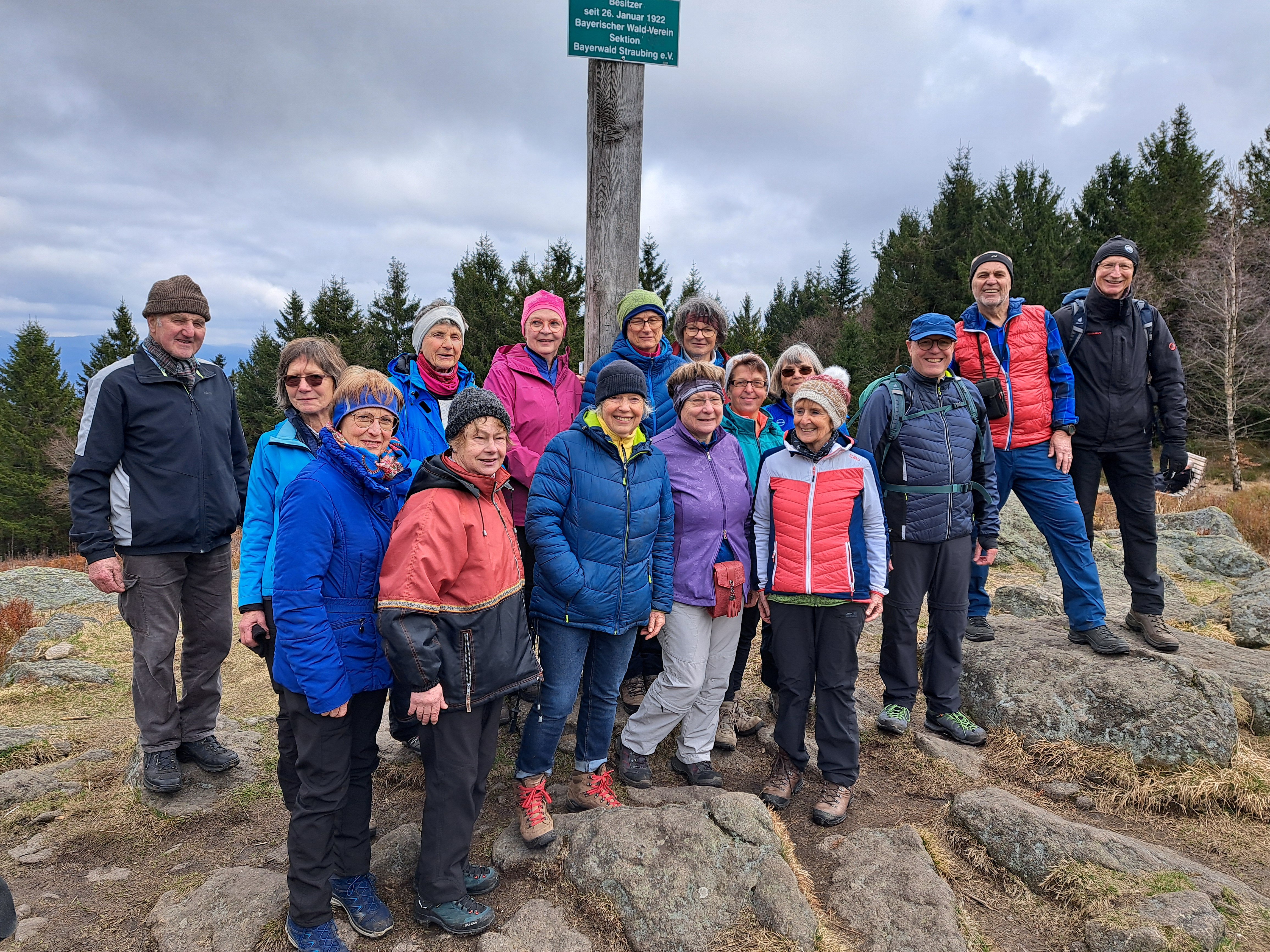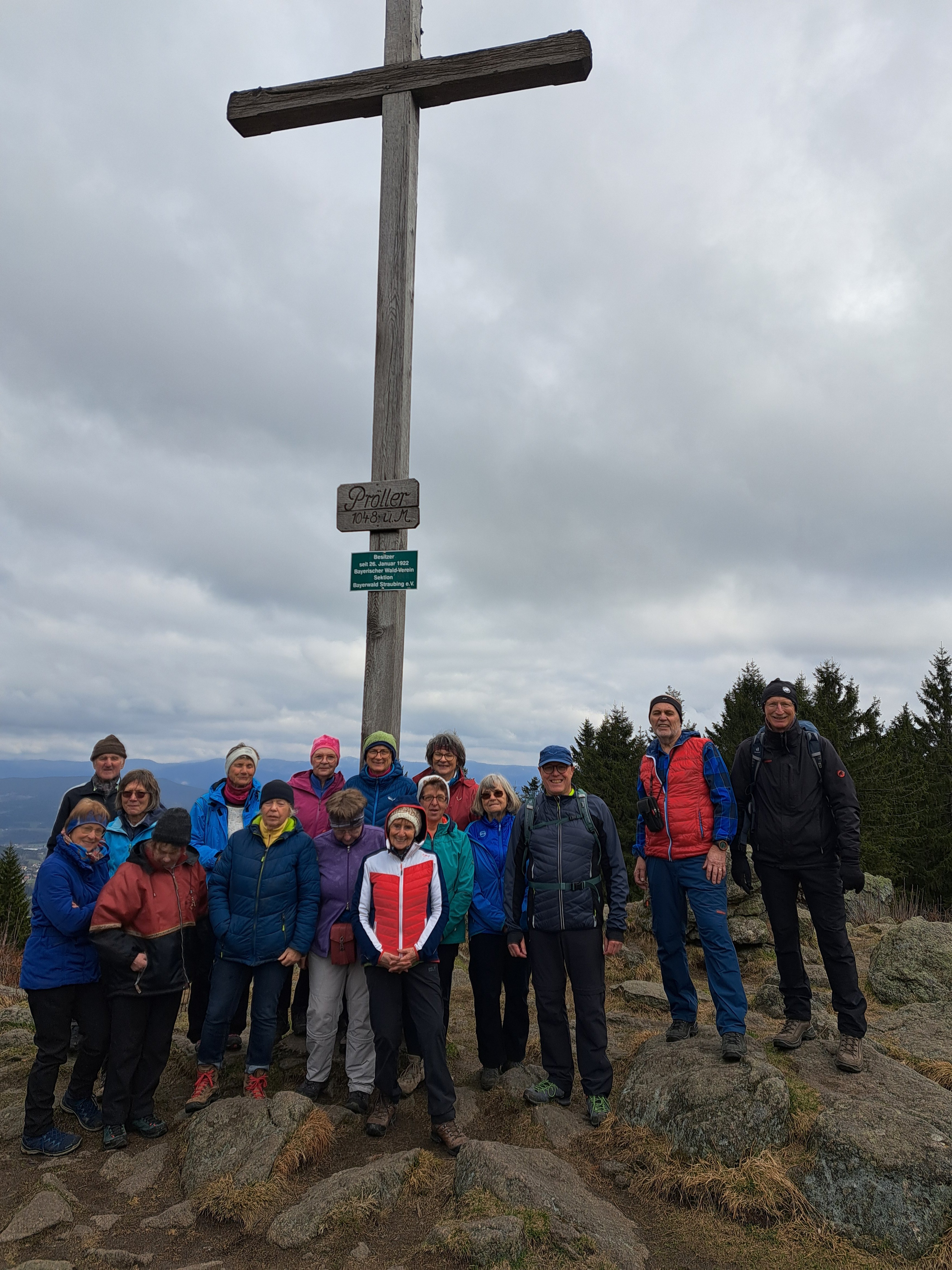 Das Wetter war nicht ideal, auch die Sicht durch die vielen Wolken am Horizont etwas eingeschränkt. Aber es blieb den ganzen Tag trocken bei 4 - 7 Grad C. Nur der Wind auf freien Flächen, etwa auf dem Pröllergipfel, war unangenehm. Aber im Wald waren wir geschützt. Am Vortag und in der Nacht hatte es in St. Englmar geregnet, sodass die Wege feucht und die Wurzeln nass waren. War aber für die Teilnehmer kein Problem. Zahlreicht Sprüche-Tafeln am Wegesrand und Holzfiguren luden zum Schmunzeln bzw. Nachdenken ein. Ausgangspunkt: Pröllerparkplatz in der Viechtacherstraße gegenüber dem Predigtstuhlresort. Auf Weg 4 bzw. Sausteinrundweg 7 vom Parkplatz leicht bergan. Nach kurzer Zeit kommt links eine Abzweigung zum Saustoa. Schöner Aussichtspunkt auf einem Felsen mit Blick ins Donautal. Wieder zurück auf gleichem Weg bis zum Goldsteig. Hier sind wir versehentlich nicht gleich links bergan gestiegen, sondern weiter fast eben auf Weg 4 nach Hinterwies gewandert. Von dort weiter auf einem kurzen Stück Teerstraße bis zur Abzweigung Ahornwies mit Landkartentafel und weiter hinten einer Tafel zur dortigen Wachholderheide. Weiter auf einem Wiesenweg bis zum Waldrand, dort nach rechts bis zu einer Schranke, dann links auf schönem Waldweg bis zum Gipfel der Käsplatte (988 m). - 1 Std. 40 Min. Zurück auf gleichem Weg bis zur Teerstraße bei der Landkartentafel in Hinterwies. Nun Aufstieg zum Pröllergipfel (1048 m) erst kurz durch Wald, dann über die grasige Skipiste mit Schneeresten ganz oben. - 55 Min. Abstieg auf Pröller Hauptweg (Goldsteig) vorbei an der Räuber Heigl Höhle mit markantem, moosbegrüntem Felsaufbau. Danach weiter auf einem Forstweg bis zum Parkplatz gegenüber der Abzweigung zum Predigtstuhlresort an der Teerstraße. – 50 Min. Höhenunterschied: 240 m Gesamtgehzeit mit Pausen: 4 Std. 15 Min. – Pausen: 50 Min. Danach Einkehr im Gasthaus "Am Predigtstuhl" gegenüber dem Parkplatz. |
