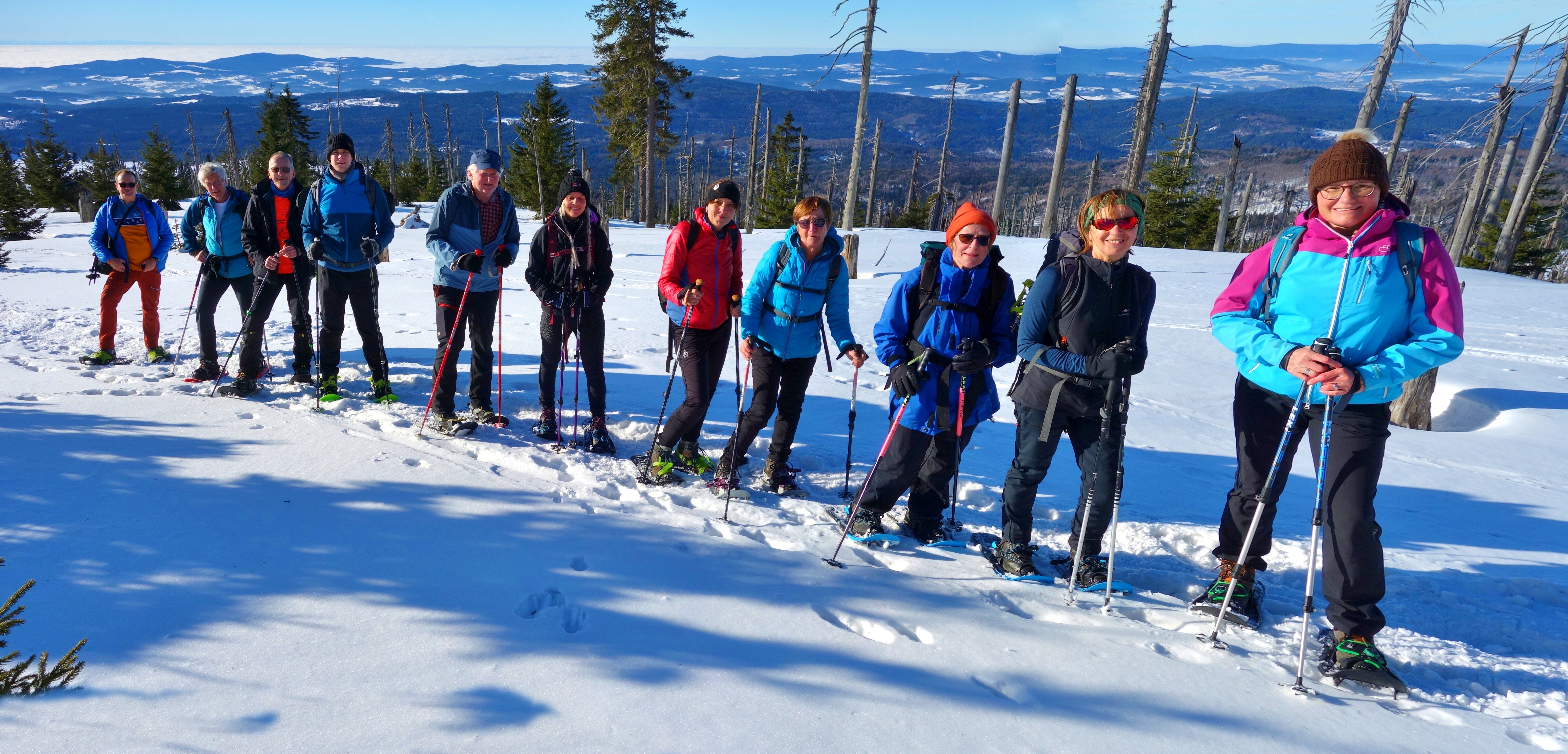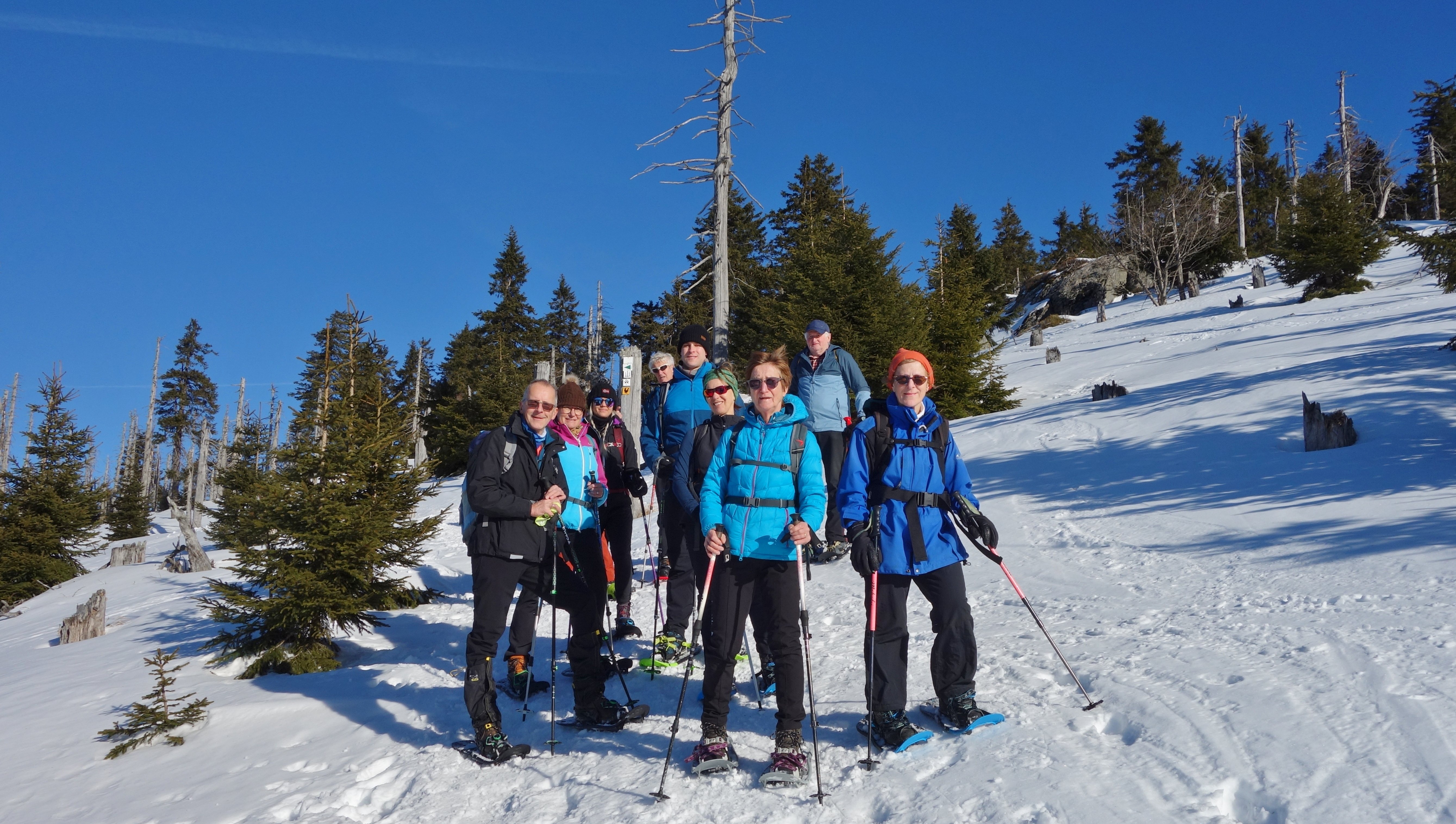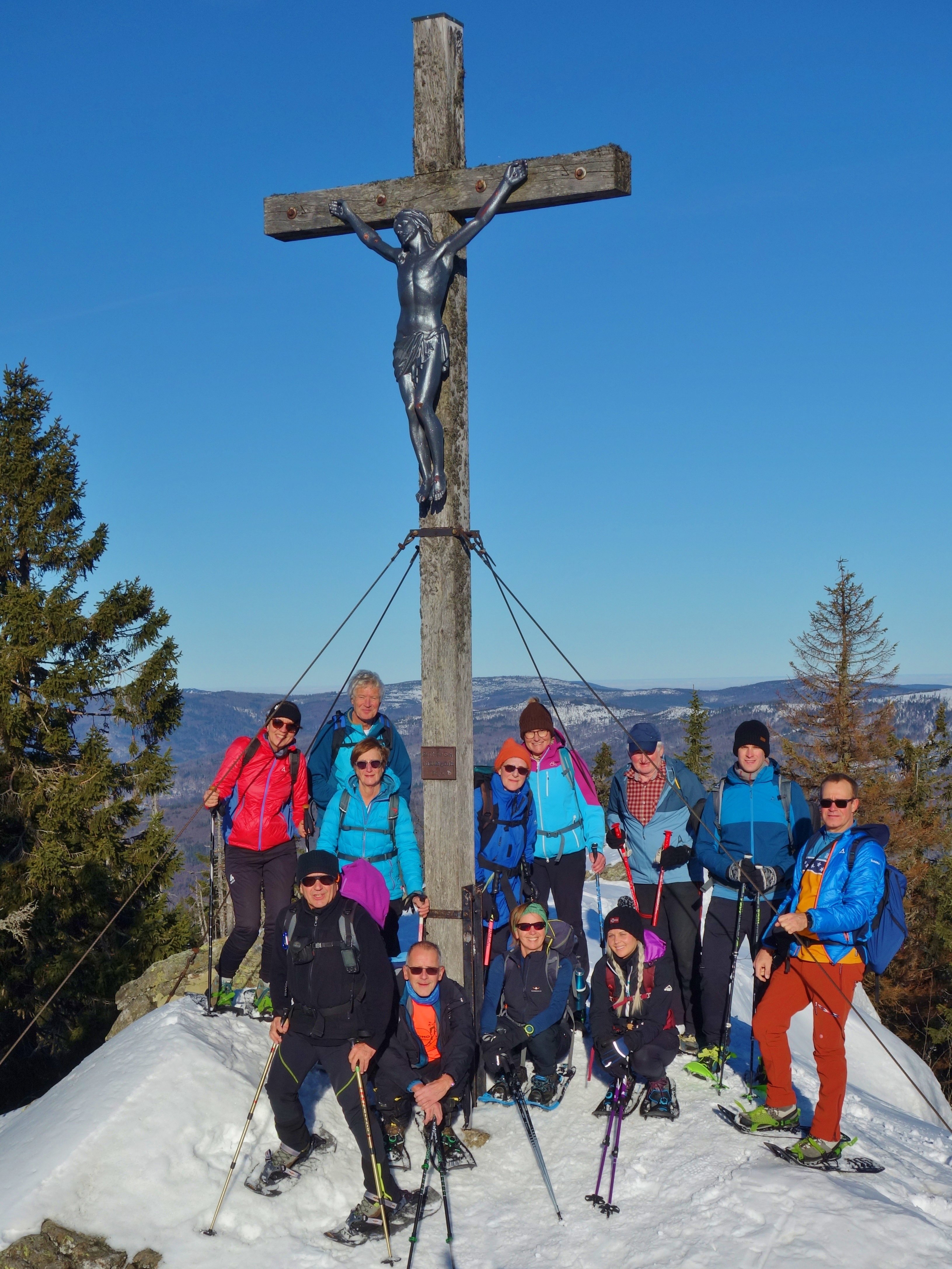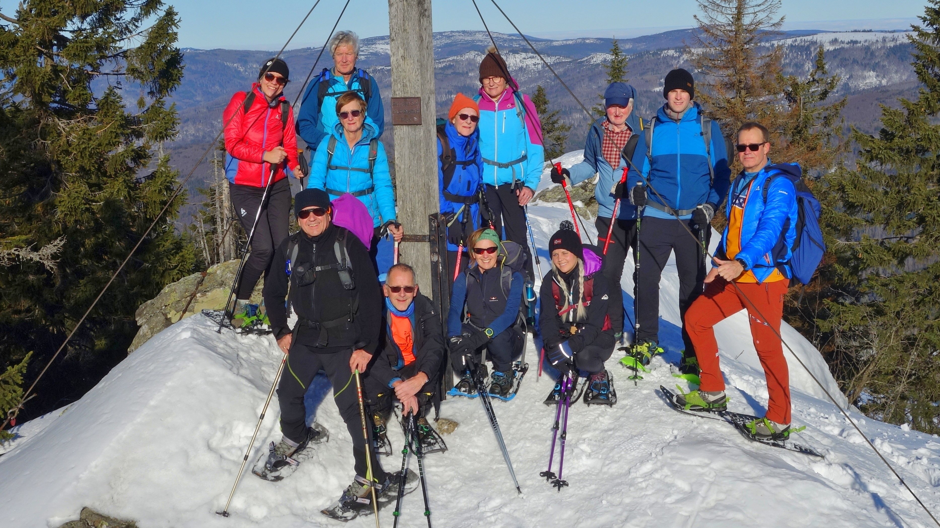 12 Mitglieder der DAV Sektion Pfarrkirchen stiegen unter der Leitung von Karl-Heinz Hager auf den Großen Rachel (1452m). Der zweithöchste Gipfel im Bayerwald ist zwar nicht so bekannt wie der Große Arber, hat aber gerade deswegen seine eigenen Reize: Unberührte Natur und kilometerlange Wege im Kerngebiet des Nationalparks Bayerischer Wald. Ausgangspunkt für diese herrliche Wintertour war der Parkplatz Gfäll (950m) bei Spiegelau. Von hier aus zieht der sonnigste Aufstiegsweg hinauf zum Waldschmidthaus. Von hier ging es dann mit den Schneeschuhen weiter hinauf auf den immer steiler ansteigenden Weg zum Gipfel. Die verdiente Gipfelpause wurde im Windschatten an der Bergwachthütte unterhalb des Gipfelkreuzes genossen. Beim Abstieg zum Waldschmidthaus konnten die Schneeschuhwanderer die grandiose Aussicht zum Dachstein, zu den Berchtesgadener Alpen und weiter bis zum Großen Arber dem höchsten Berg im Bayerwald genießen. Um den sonnigen Tag so richtig zu auszuleben, ging es ab dem Waldschmidthaus auf dem Goldsteig in nordwestlicher Richtung vorbei an der Rachelwiese bis zum Aussichtspunkt zum Frauenauer Trinkwasserspeichersee. Zurück beim Waldschmidthaus stieg die Gruppe dann über den Aufstiegsweg hinunter zum Parkplatz in Gfäll. Nach einer kurzen Kaffeepause in Spiegelau ging es wieder zurück nach Pfarrkirchen.