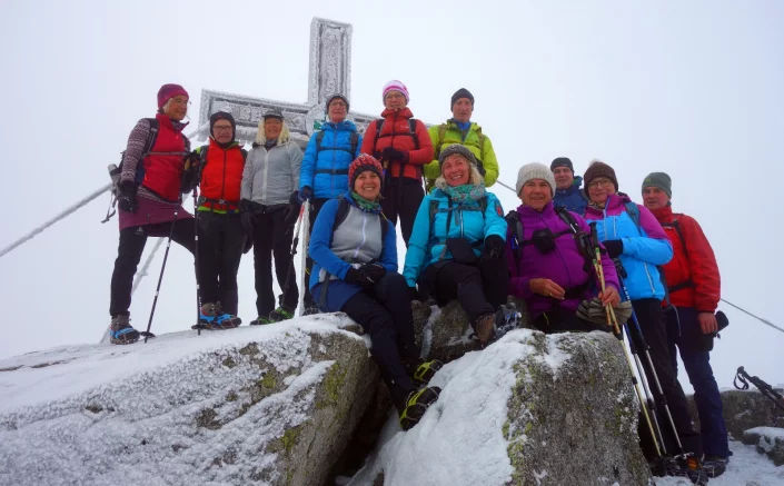Zwölf Mitglieder der Sektion Pfarrkirchen des DAV fuhren nach Oberschwarzenberg im Mühlviertel um vom neu angelegten Parkplatz auf den österreichisch-tschechischen Grenzgipfel des Plöckenstein zu wandern. Da bis zum Gipfel mit wenig Schnee zu rechnen war und die Pfade ausgetreten waren, ließen wir die Schneeschuhe im Bus und nahmen dafür die Grödel mit.