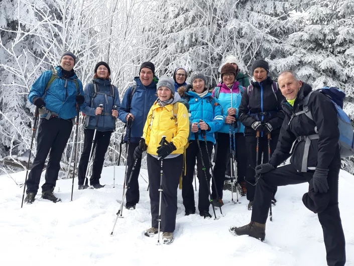 Wetterglück hatten 11 Wanderer auf ihrer Rundtour, auf verschneiten Pfaden, zwischen Bayern und Tschechien. Mit Elfriede Niedermeier wanderten die Teilnehmer von Finsterau Wistlberg zuerst abwärts zum Reschbach. Idyllisch am Bach entlang wurde über die "Alte Klause" die Reschbachklause, mit seinem noch zugefrorenen See erreicht. Nach einer Rast, ging es entlang der tschechischen Grenze zum Siebensteinfelsen 1263 m. Durch die Schneefälle, am Vortag, präsentierten sich die Bäume im Winterkleid. Aber auch die Sonne ließ sich immer wieder blicken. Der Weiterweg führte nach Bucina (Buchwald). Hier sind noch Relikte vom "Eisernen Vorhang" zu sehen. Im Alpska Hotel wurde dann eingekehrt. Der Rückweg erfolgte ebenfalls auf Pfaden zur Teufelsklause. Entlang des Schwellgrabens wurde der Finsterauer Filz erreicht. Auf schön angelegten Bohlen durchschreitet man den Filz (ein Moorgebiet), der noch verschneit war. Bald danach war auch schon der Ausgangspunkt Wistlberg erreicht. Noch reichlich Schnee und schneebedeckte Wege, machten die Tour zu einer Genuss-Wintertour.