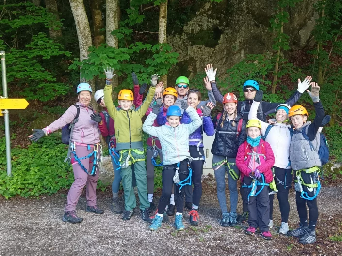 Am darauffolgenden Wochenende starteten einige mutige Familien in die Berge rund um Lofer und Waidring. Zehn Teilnehmer und drei Guides waren zuerst in Weißbach bei den Gams-Klettersteigen unterwegs, um erste vertikale Schritte zu machen. Unter der Leitung von Marion, Serafina und Marcus Urban besuchte die Gruppe zuerst den relativ neuen Gams-Kitz-Klettersteig, welcher ideal als Einstiegstour ist. Der Steig hatte neben den üblichen Klammern und Tritten auch Leitern und eine kleine Seilbrücke und wurde von allen Teilnehmenden sehr gut gemeistert. Nach einer kurzen Stärkung ging es im benachbarten Zahme Gams-Klettersteig bereits etwas schwieriger zur Sache, aber auch hier zeigten sich die Familien durchaus talentiert und schwindelfrei. Belohnung hierfür war ein leckere Jause am Parkplatz.