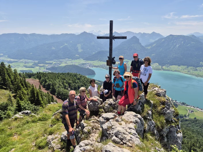 Eine Wanderung führte, bei sommerlichem Wetter, 11 Alpenvereinssenioren ins Salzkammergut. Mit Elfriede Niedermeier startete die Gruppe bei Holzerbauern, bei St. Wolfgang. Vorbei an der Mauruskapelle wurde der "Zwergerlweg" erreicht. Auf Bildtafeln sind verschiedene Hinweise angebracht. Auf steilem, steinigen Steig , mit schönen Aussichten, wanderte die Gruppe Richtung Sommeraualm. Ständig ansteigend wurden dann die Vormaueralmen erreicht und der nahe Schafberg zeigte sich. Bei einem schönen Aussichtsplatz wurde eine Brotzeitpause eingelegt. Über Almgelände folgte der Aufstieg zum Vormauerstein 1450 m und nach einem kurzen Steilstück war der Gipfel erreicht. Hoch über dem Wolfgangsee konnte das Panorama der Salzkammergutberge bewundert werden. Ebenso der Attersee und die Berge vom Toten Gebirge. Nach ausgiebiger Gipfelrast, die Ausblicke genossen, wurde zu den Almen abgestiegen. Der Abstieg nach St. Wolfgang war auf dem Forstweg, als gemütlicher Abstieg geplant. Jedoch wurde der lange Weg, es fanden Bau- und Instandsetzungsarbeiten statt, sehr unwegsam. Auf Fels und Gesteinswällen ging es abwärts. Eigentlich war der Weg gesperrt, es wurde jedoch oben vergessen, ein Sperrschild aufzustellen. Aber trittsicher konnte auch diese "Schickane" von allen gut gemeistert werden. Ein kurzer, knackiger Aufstieg zum Holzerbauern beendete die Tour. Bei der Einkehr ließen es sich alle gut gehen. Vor der Heimfahrt genoß die Gruppe noch das wunderbare Panorama des Salzkammerguts.