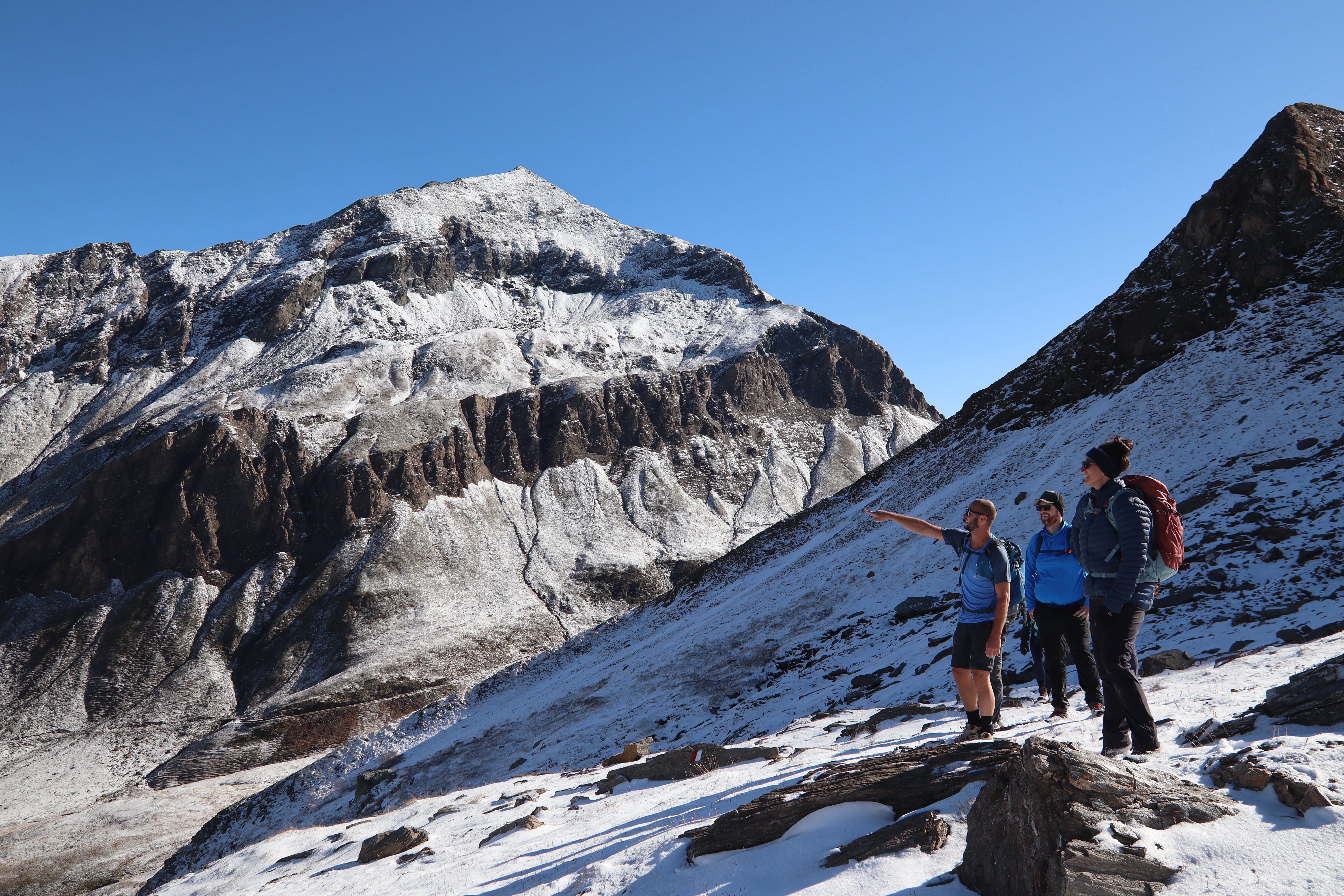Der Schnee blieb über Nacht liegen, was die Gruppe nicht von der Besteigung der Wilden Kreuzspitze (3132m) abhielt. Über das Sandjoch, stiegen wir von Norden her, abseits der Touristen, auf den höchsten Berg der Pfunderer Berge auf. Am Gipfel feierten vier der Teilnehmer die Besteigung ihres ersten 3000ers. Über den Normalweg, Richtung Süden stiegen wir ab und nahmen noch einen zweiten Gipfel mit, die 2988 Meter hohe Blickenspitze. Nach einem kräfteraubenden Aufstieg durch Schutt und Geröll, genossen wir den Blick auf die weltberühmten "Drei Zinnen".