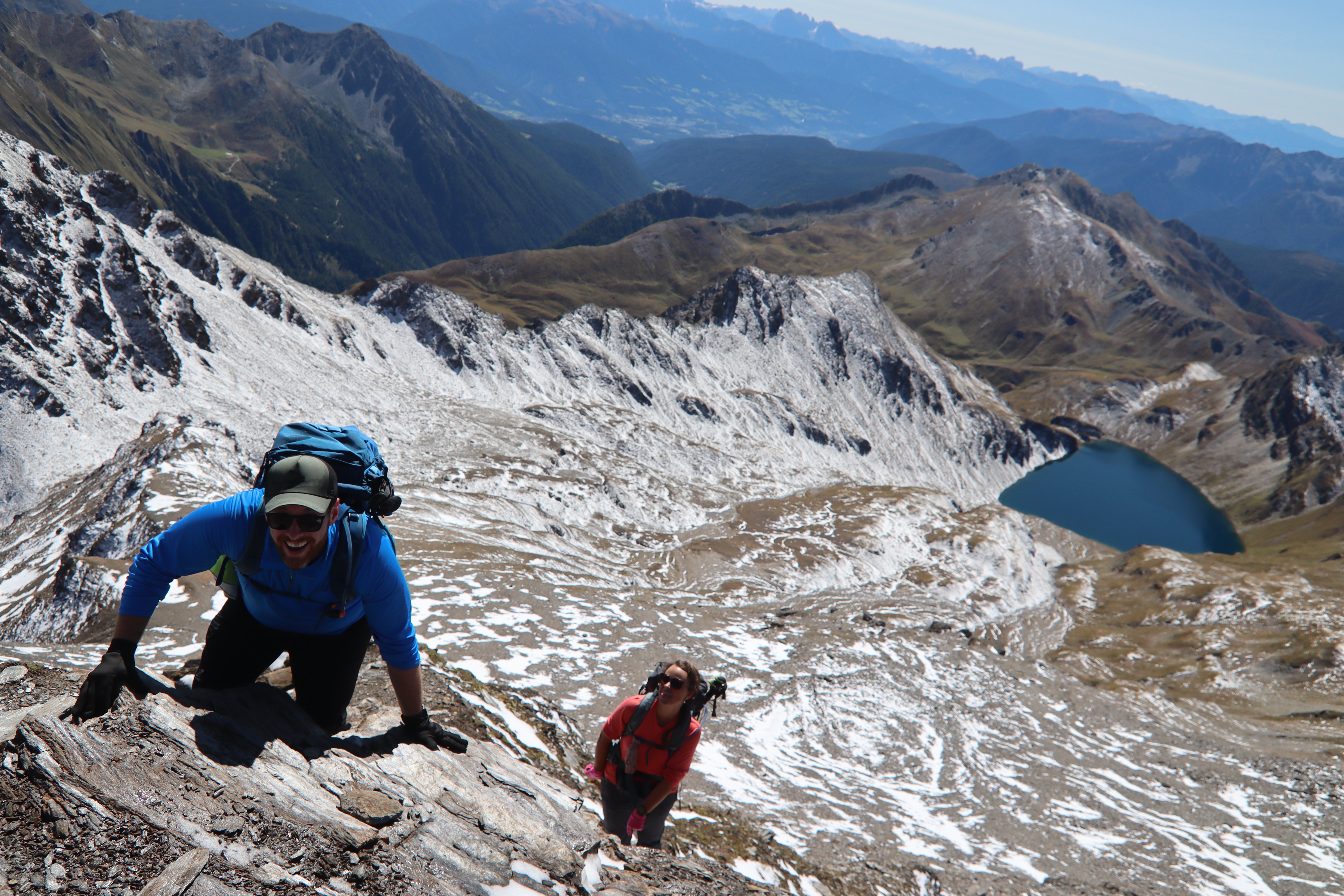 Am nächsten Tag stiegen wir Richtung Wurmaulspitze (3022m) auf. Der Schnee war bereits wieder komplett abgeschmolzen. Über steile Grashänge erreichten wir nach 800 Höhenmetern das wunderschöne Gipfelkreuz und genossen den Blick auf Ortler, Großglockner und die Dolomiten. Beim Abstieg passierten wir erneut die Fane Alm, wo wir zu Musik und festlicher Stimmung erneut einkehrten. Gestärkt und einfach glücklich über die erreichten Gipfel der Tour fuhren wir über den Brenner wieder zurück Richtung Heimat.