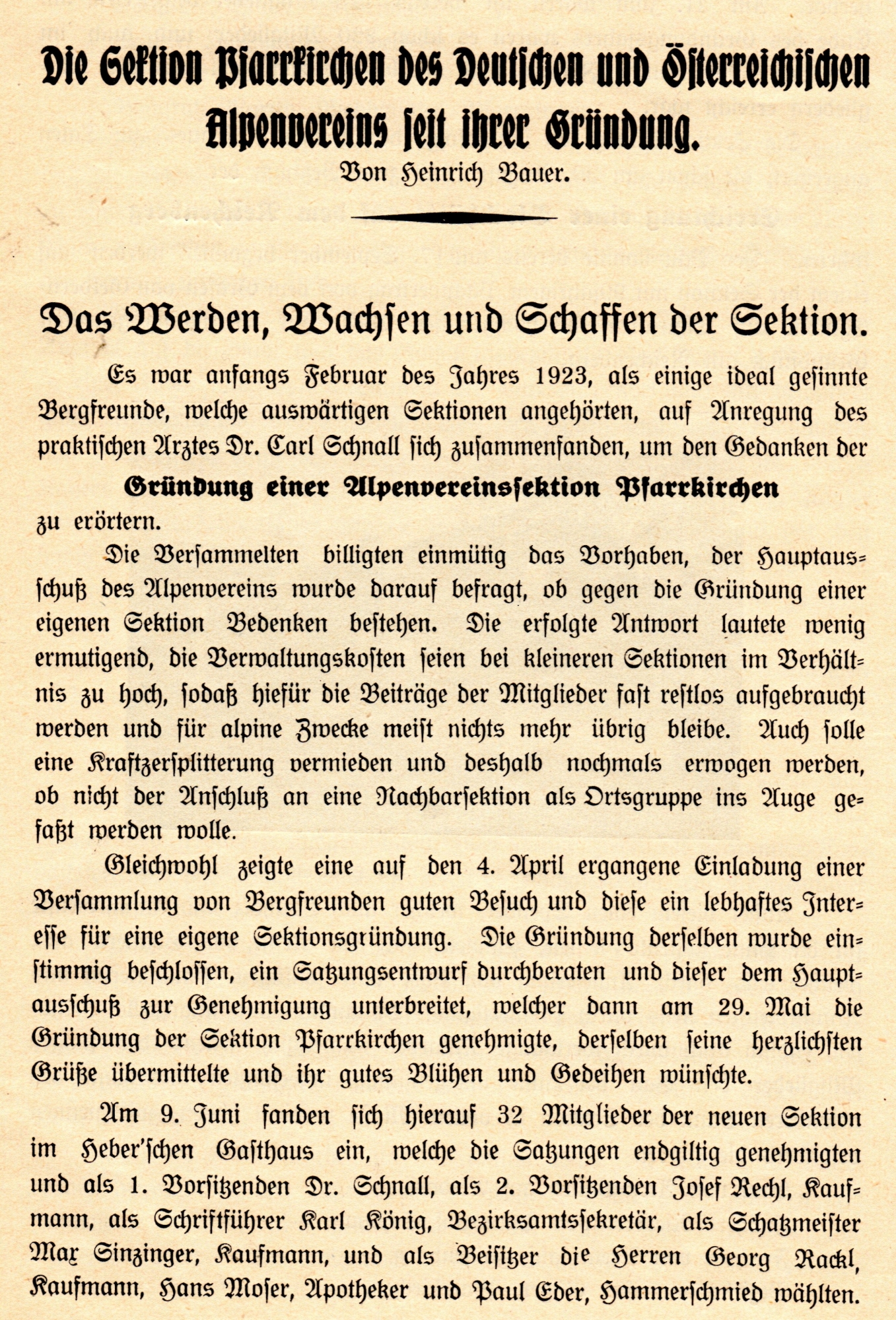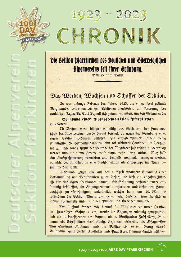 Im Frühjahr 1923 haben ein paar idealistisch gesinnte Bergfreunde die Gründung der Alpenvereinssektion Pfarrkirchen angestrebt. Am 4. April wurde die Gründung beschlossen und am 29. Mai 1923 durch den Hauptausschuss des Deutschen Alpenvereins genehmigt.